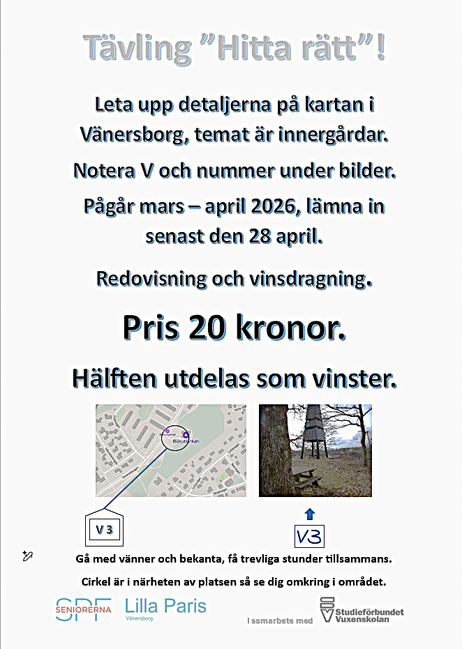 ”Hitta rätt” -tävling med temat innergårdar, finns att köpa på våra möten från den 17 mars 2026 så långt lagret räcker.Gäller mars - april och sista dagen för inlämning 28/4 Lycka Till! Se info här