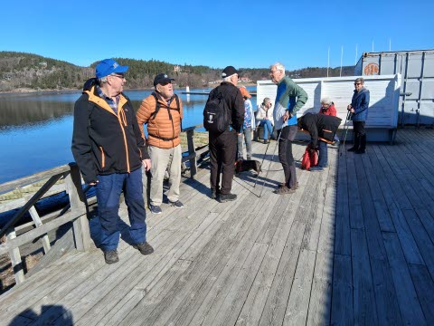 En solig vandring i Ljungskile som startade vid rastplatsen. Vi var 10 stycken som vandrade längs vattnet fram till kallbadhuset, för ett första stopp, där vi betraktade förödelsen efter stormen Dave.