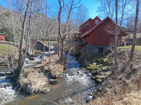 Vi fortsatte sedan på strandpromenaden förbi Ljungskile kyrka. Där gick vi längs Bratteforsån fram till Lyckorna Kvarn. Kvarnen har varit i bruk från 1804 fram till i början på 1970-talet. Välbehövlig fika i solskenet.
