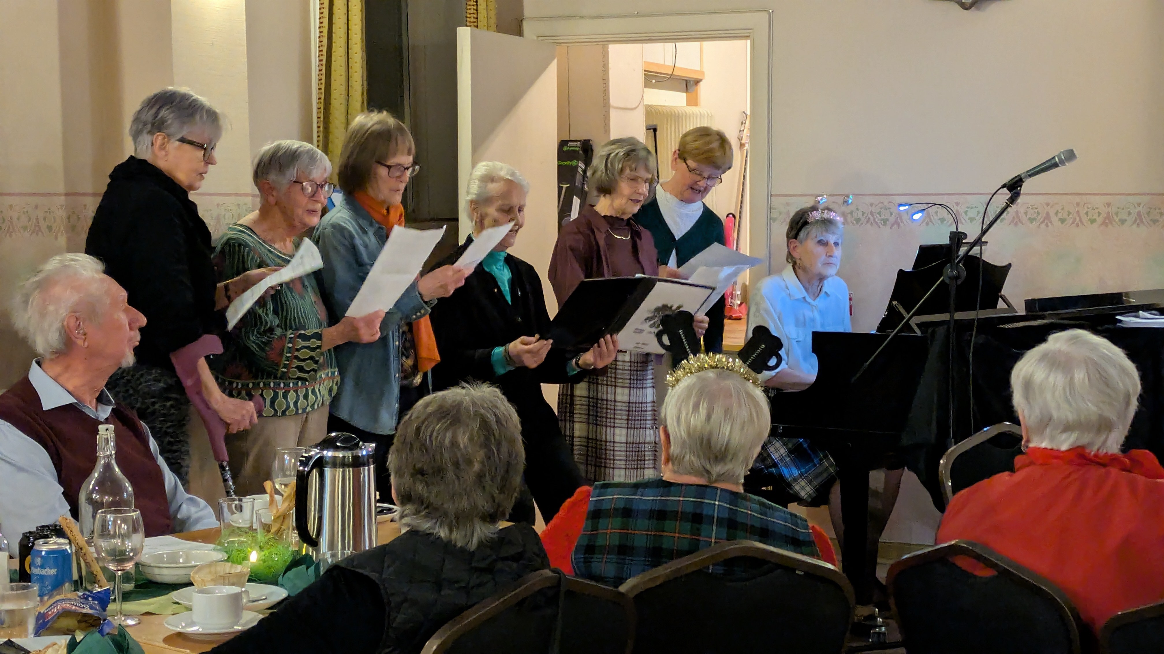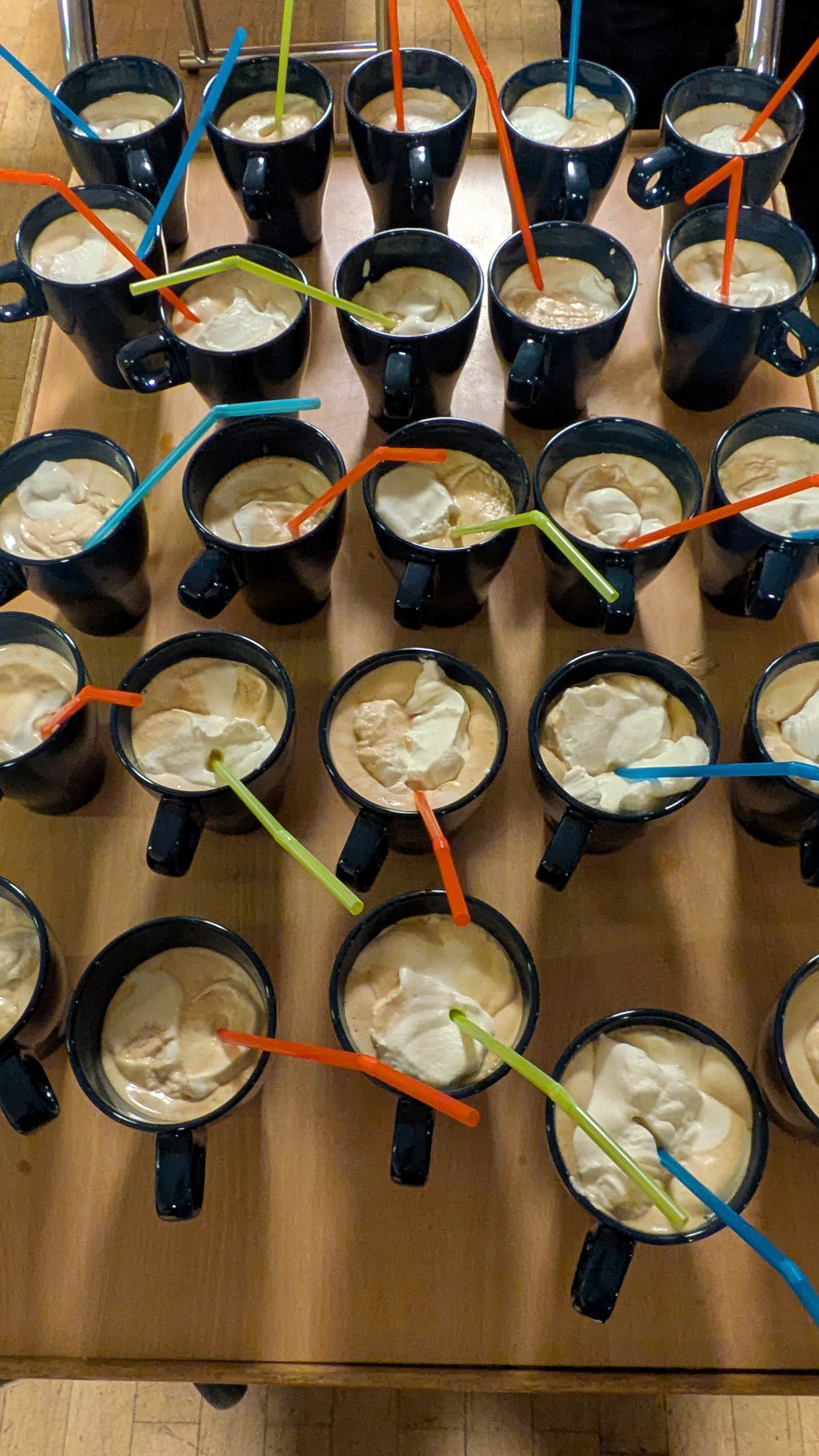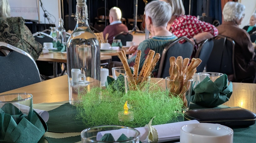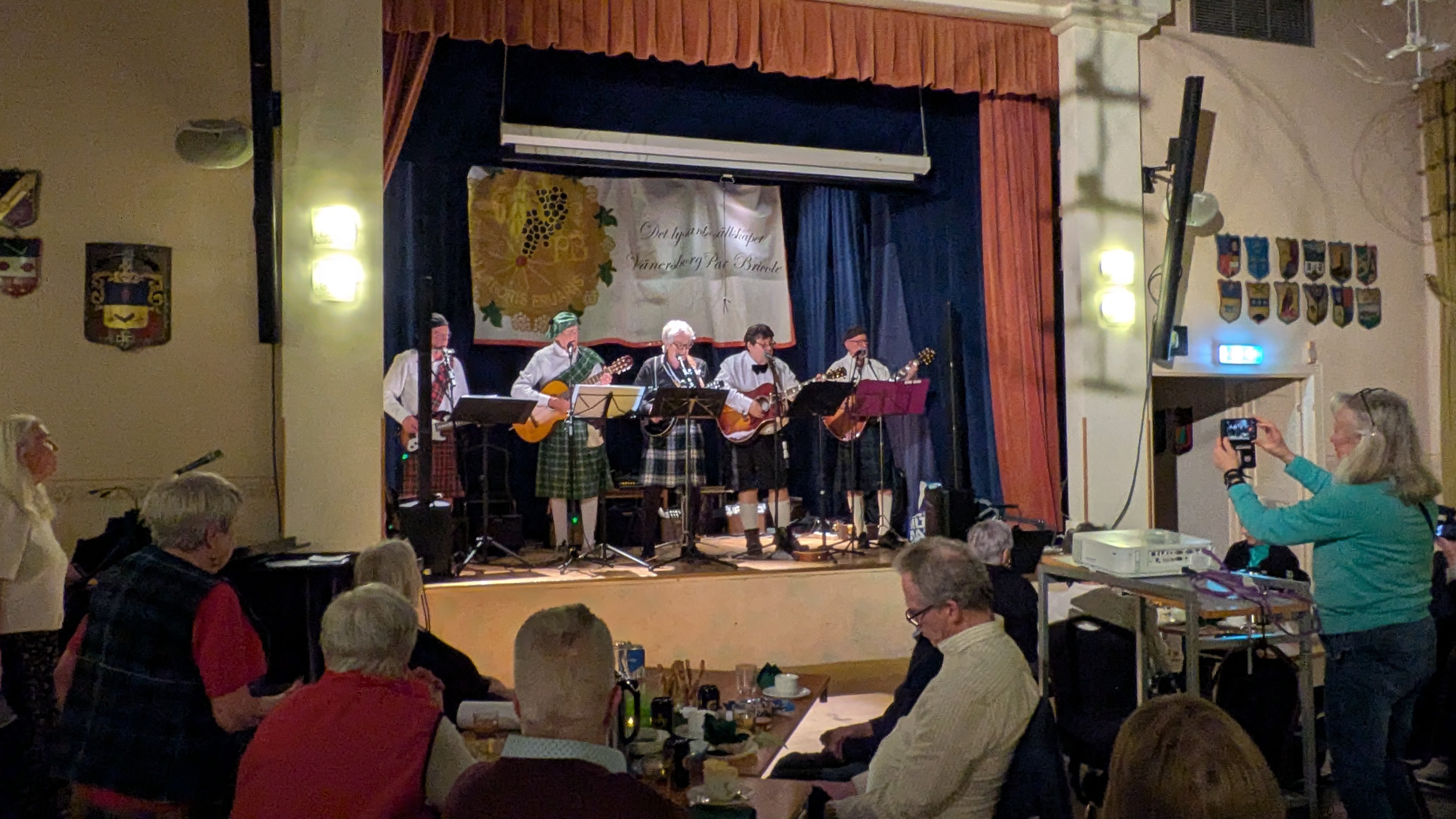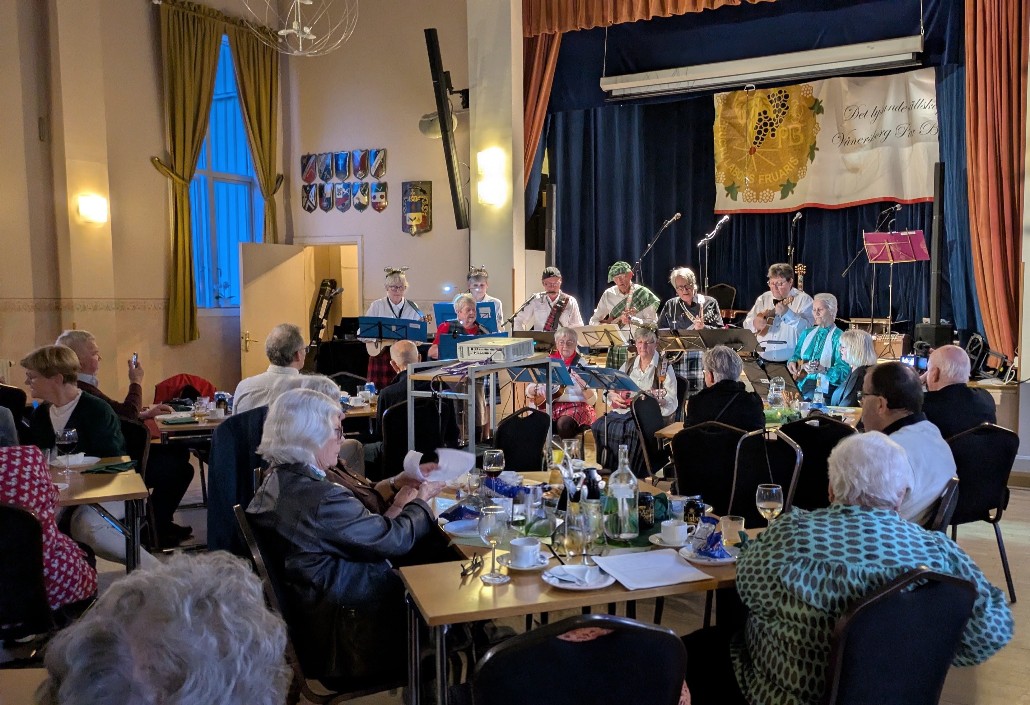 Vi fyllde hela salen och maxtalet på så många man tog in för ikväll var nått, 60 personer. Passa på och anmäl er direkt nästa gång det bjuds på något liknade. Här var det musik och sång både av gitarrgrupp, ukulelegruppen och delar av kören samt solosång. Icke att förglömma allsång med häfte till eller bara sånger som man kunde ändå. När vi kom var det vackert uppdukat och möblerat så att vi lättare kunde samtala med de som satt runt borden. Ett glas av valfri dryck samt tillugg ingick i inträdet, sedan kunde man köpa mer dryck till självkostnadspris. Vi bjöds på goda snittar och goda pajer. Lite senare blev det kaffe och därefter korv och bröd för de som önskade. Pricken över iet rullade in på två vagnar, Irish coffee. För de som önskade förstås.