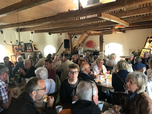 Efter att ha hämtat upp 50 medlemmar i föreningen styrde bussen kosan söderut. Vid 10 tiden var vi framme i Rit och Målerigården strax söder om Varberg.