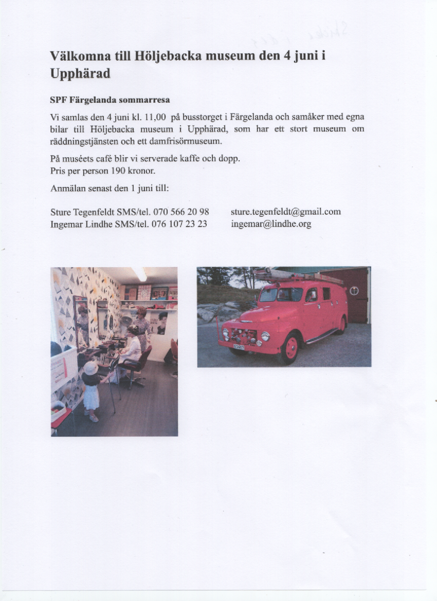 Vi samlas den 4 juni kl. 11,00 på busstorget i Färgelanda och samåker med egna bilar till Höljebacka museum i Upphärad, som har ett stort museum om räddningstjänsten och ett damfrisörmuseum.