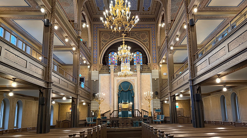 Göteborgs Synagoga uppfördes 1855. Byggnadsstilen är en blandning av morisk, bysantisk och svensk nationalromantisk stil. Synagogan är en Egalitär församling, vilket innebär att olika riktningar i judendomen samsas under samma tak. Guiden Dan berättade att han ofta har skolklasser som besökare och att ett viktigt budskap till dem och till oss är kunskap och respekt – två viktiga egenskaper som han lärde sig av sin far!