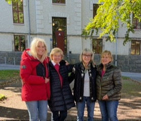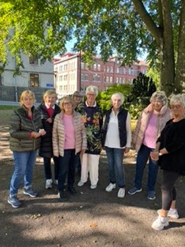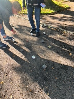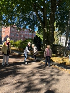 Mona och jag hamnade i samma lag efter lottning. Som motspelare hade vi Siv och Brita. Allihop var hjälpsamma och förklarade spelet och hur man skulle tänka och räkna poäng. Först till 13 var målet. Sedan gällde det att kasta så man hamnade så nära ”lillen” som möjligt. Lillen var en lite röd boll som vi turades om att slänga ut på banan.