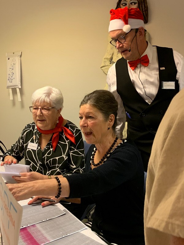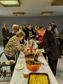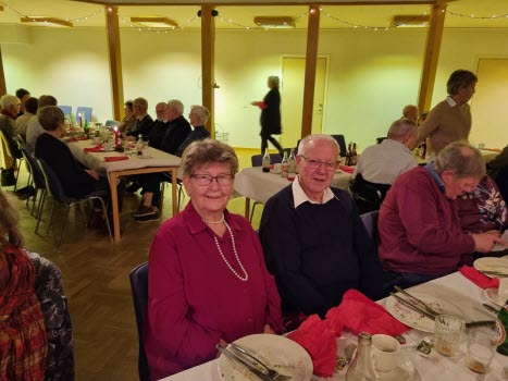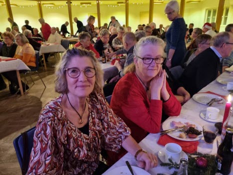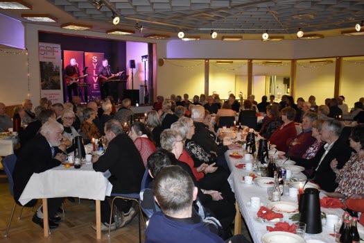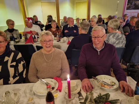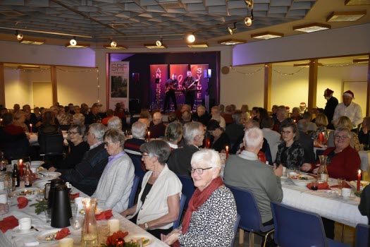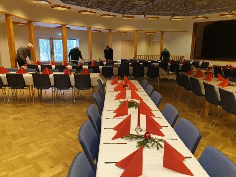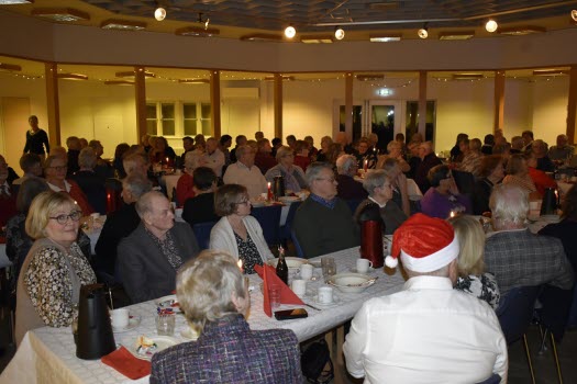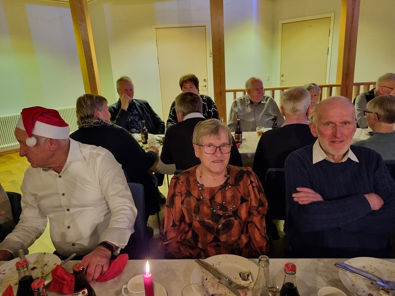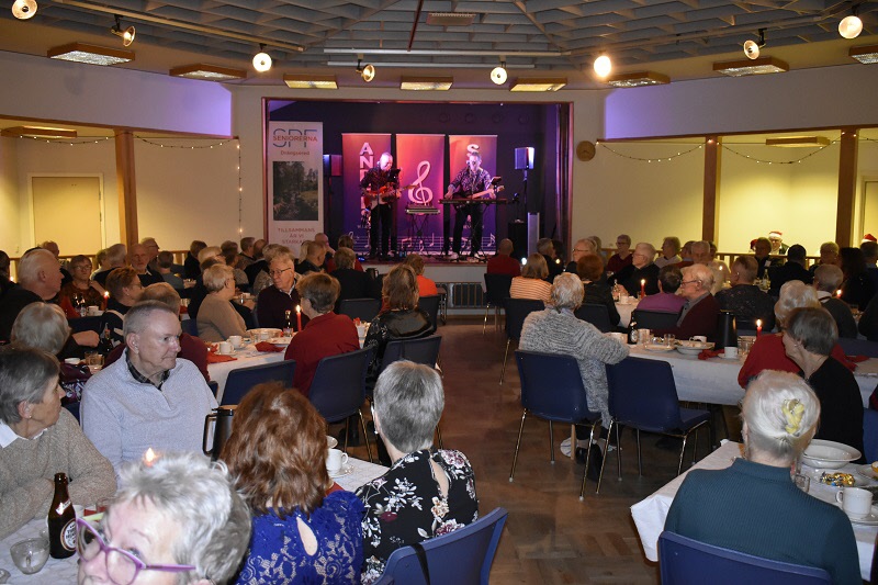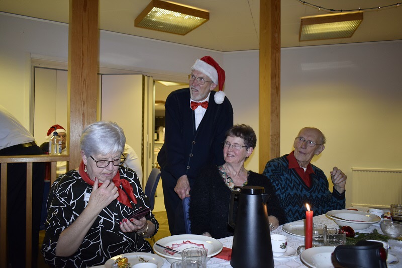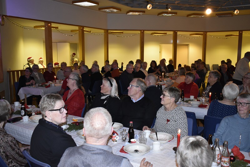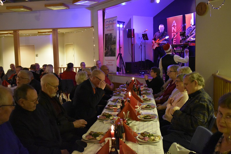 Gubbarna samlades tidigt på förmiddagen för att förbereda dukning och mat. Efter en paus mitt på dagen var det åter dags att sätta i gång med alla julens rätter. När klockan var sex kom alla 138 gästerna. En härlig samling, som fick bli avprickade och sedan köpa lotter, för att sedan få smaka på glöggen. När alla var samlade bjöds det in i stora salen, till de stämningsfullt dukade borden. En kall tallrik med sill och andra delikatesser stod och väntade. Två pigga spelmän Anders och Sylve stod för en rolig och fin underhållning. Festligheterna fortsatte med ett gående bord med varmrätter, ett grötbord och ett godisbord. Gubbarna som hade gjort det här kvällen så festlig tackades med varsin ros. Det stora julklappslotteriet avslutade kvällen med många förväntansfulla seniorer. En del hade turen på sin sida, andra fick stoppa ner sina lotter, men vi hoppas att alla gick hem mätta och glada.