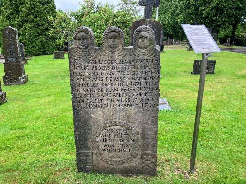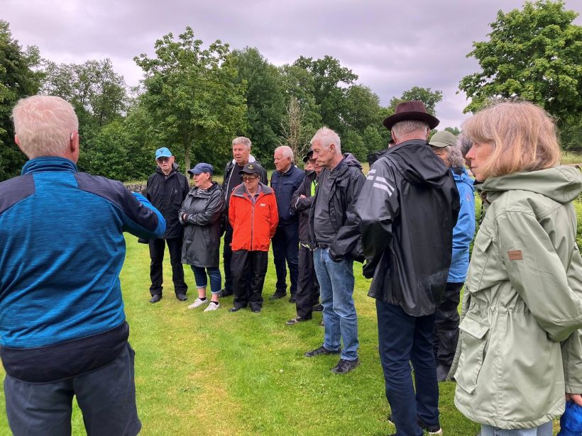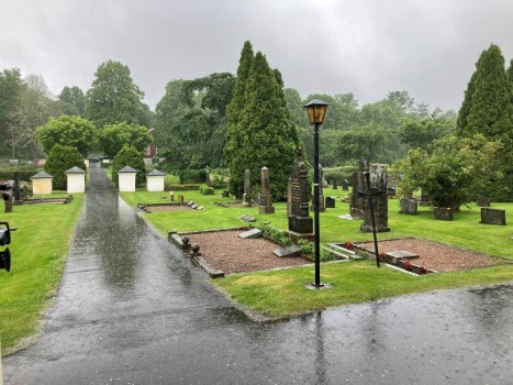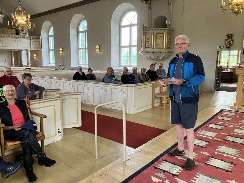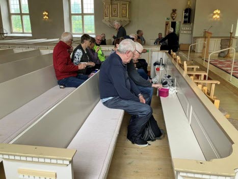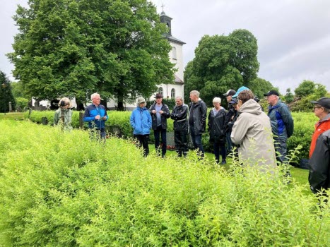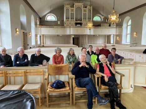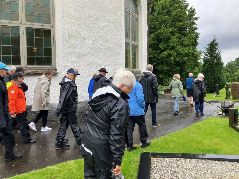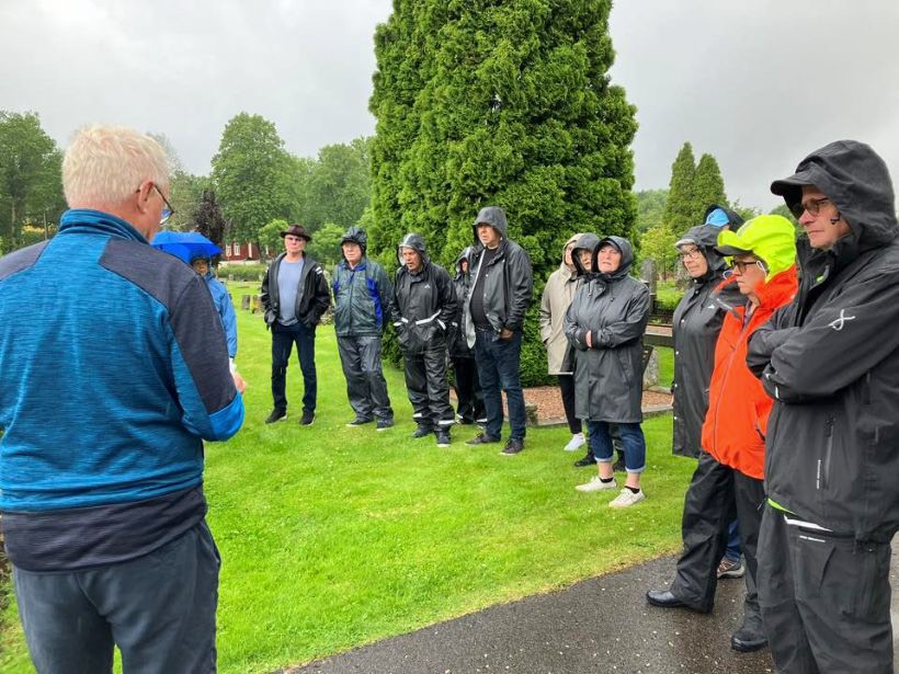 Vi var 24 SPF Seniorer som trotsade regnet och mötte upp vid Färgaryds kyrka där Ingemar och Kenneth med stor inlevelse berättade om kyrkan. Ute på kyrkogården blev det intressanta historier om personerna som ligger där, inte visste vi att man kunde använda sig av ”lånekista” t ex. Cecilia och hennes 2 makar är ju en hjärtevärmande historia. Fikat intogs i kyrkan då regnet återkom i modell ös!