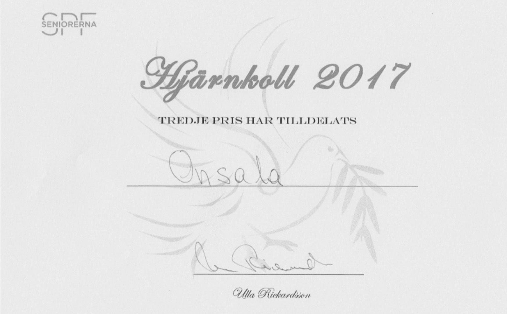 Kluriga frågor på årets Hjärnkoll som klarades med glans av vårt lag från Onsala. Bestod av Stina Johansson, Ulla Lindqvist och Bengt-Åke Lundqvist. Förtjänstfull placering - tredje pris!