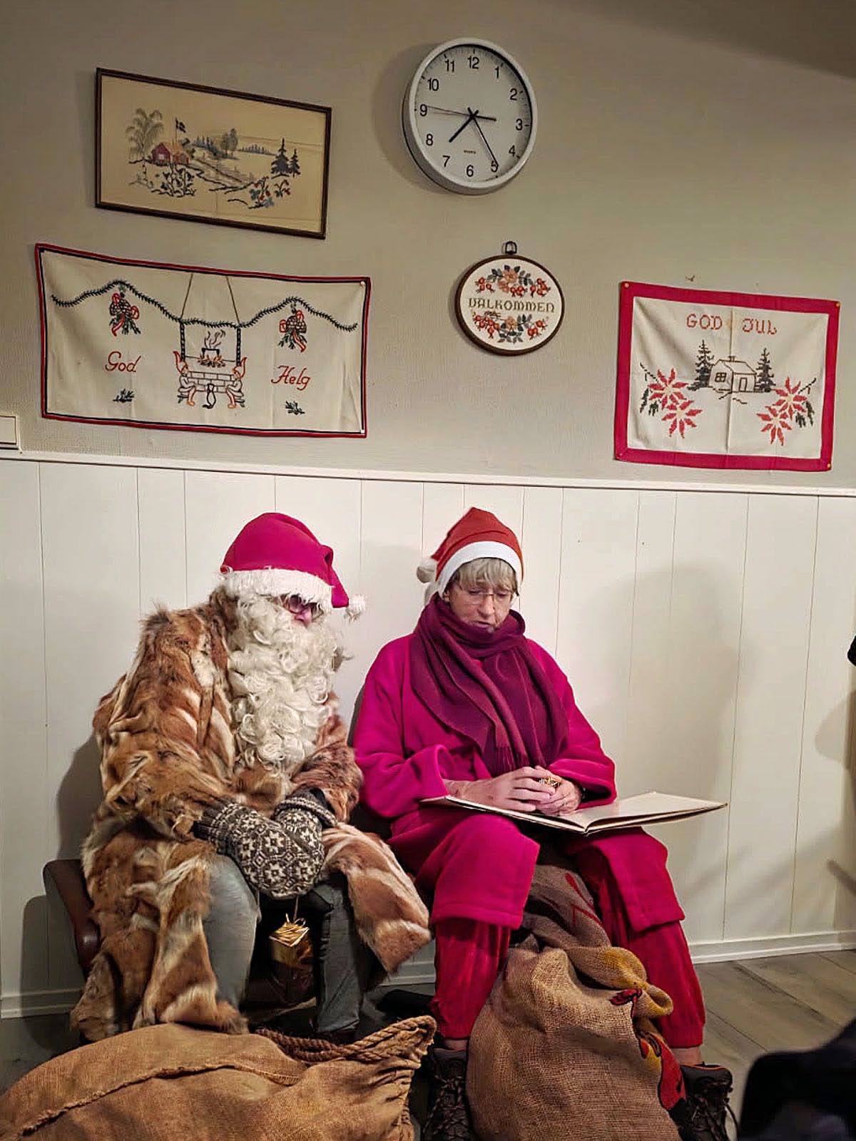 Plötsligt dök tomtemor och tomtefar upp. Tomtemor läste om tomtarnas tillverkning i tomteverkstaden och sedan fick alla deltagare var sin julklapp.