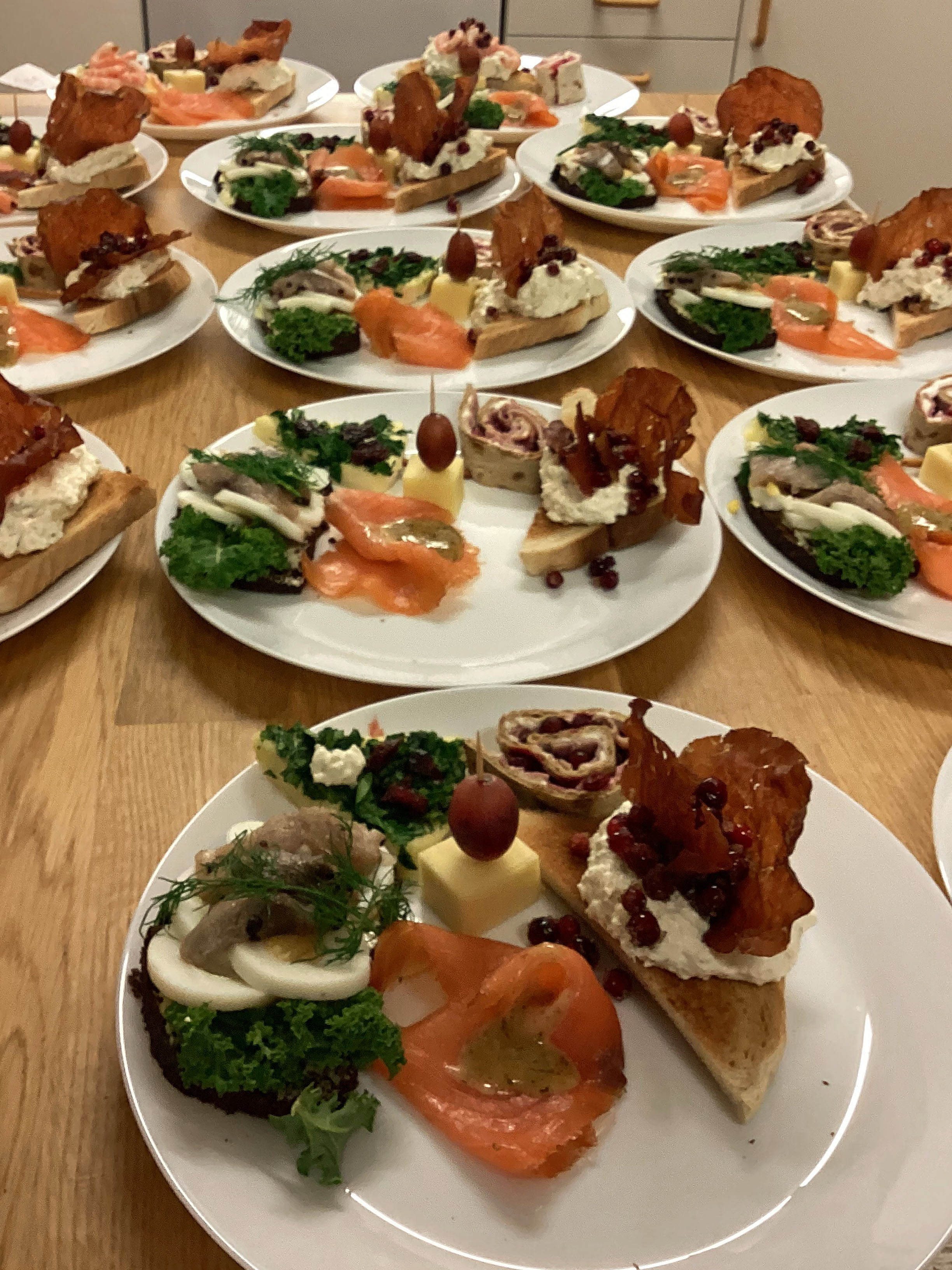 Sedan gick vi in i vår lokal och där stod framdukat på varsin tallrik många smårätter. Så småningom blev det kaffe med flera godbitar till.