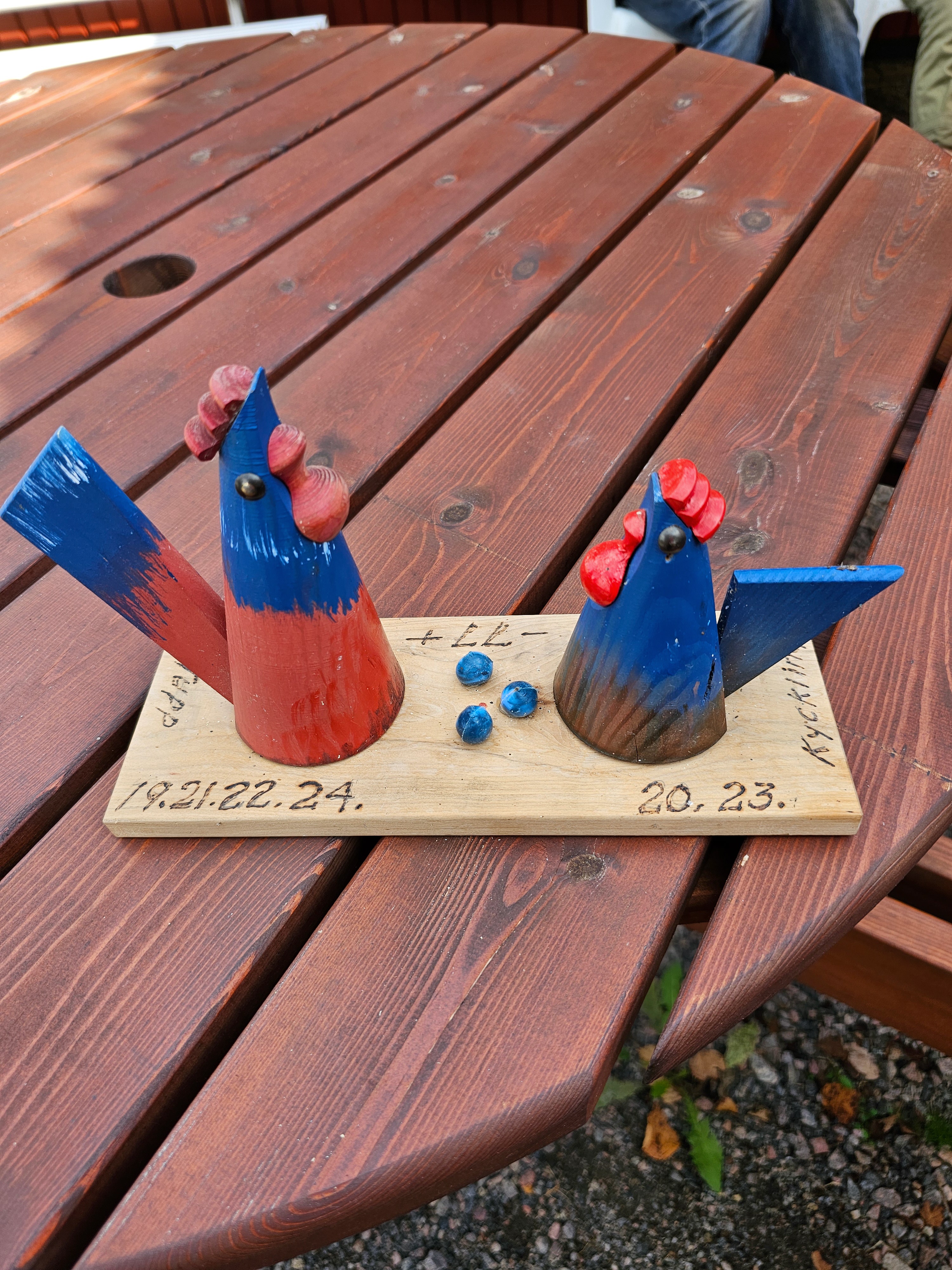 Tupparna är 77år och äldre , Kycklingarna är 77år och yngre, Tupparna vann med 9-7 som ristas in i Boulepokalen Tupp och Kyckling.