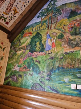 Mätta och belåtna åkte vi vidare till Unos djur. Först filmvisning i bygdegården, unik i sig, med målade motiv i tak och på väggar, sen gick vi till museet och beskådade Unos konstverk.