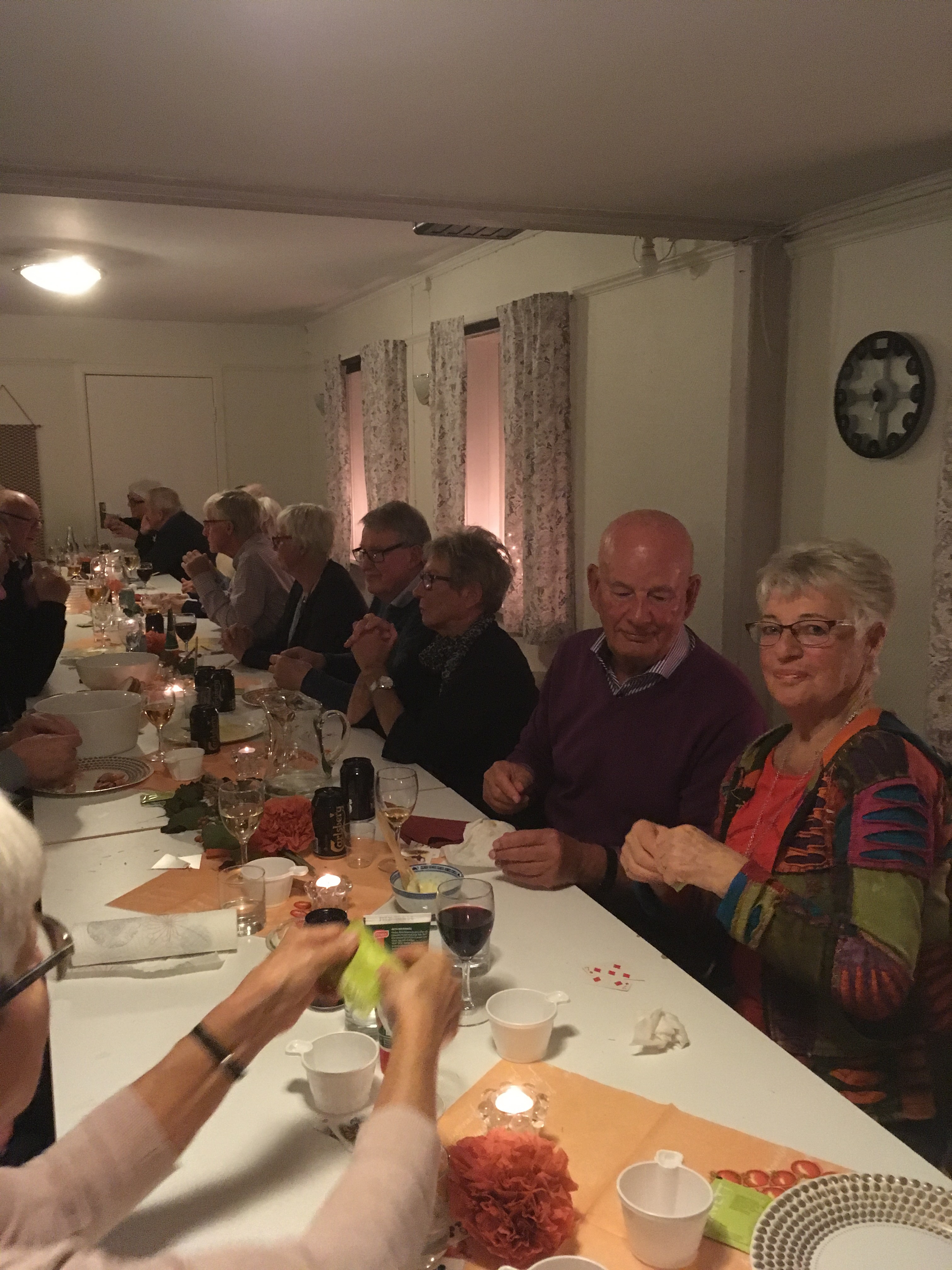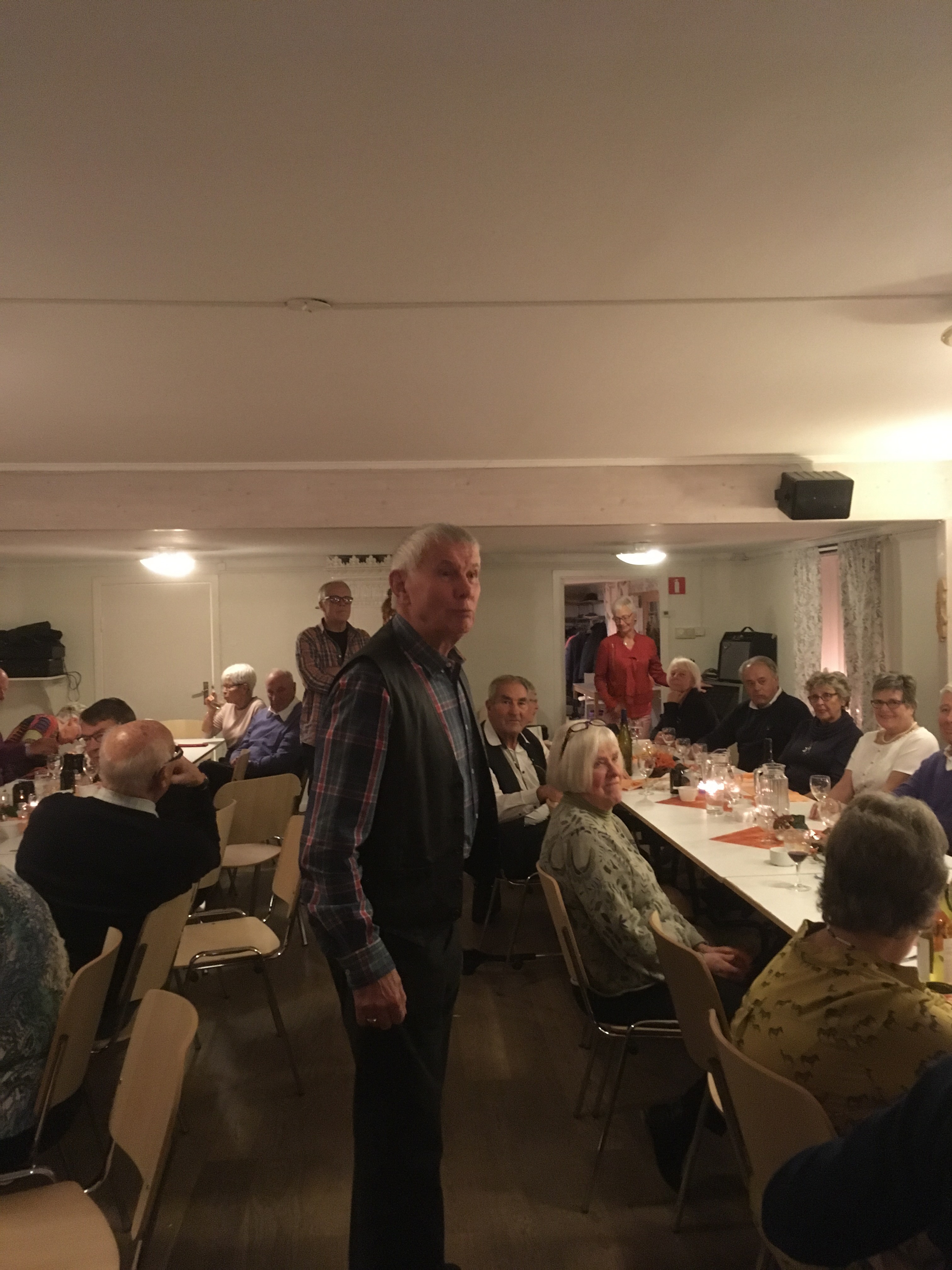 För att undvika att gästerna satte sig parvis eller med grannar eller redan goda kompisar/vänner hade vi bordsplacering som Pia hade ordnat. Hon hade lagt ut itu-klippta spelkort på de redan dukade borden. Ett klippt kort på varje plats. En viss sorts kort till damer och en annan sort till herrar, för att få varannan på plats. När gästerna kom och betalat 100 kronor fick damer, resp. herrar andra delen av korten. Det innebär att det genast blev ett minglande när man letade efter sina platser.