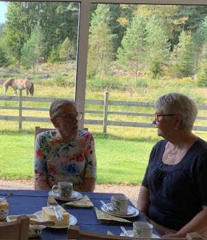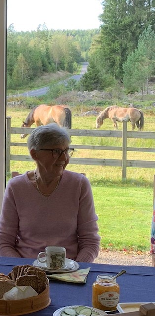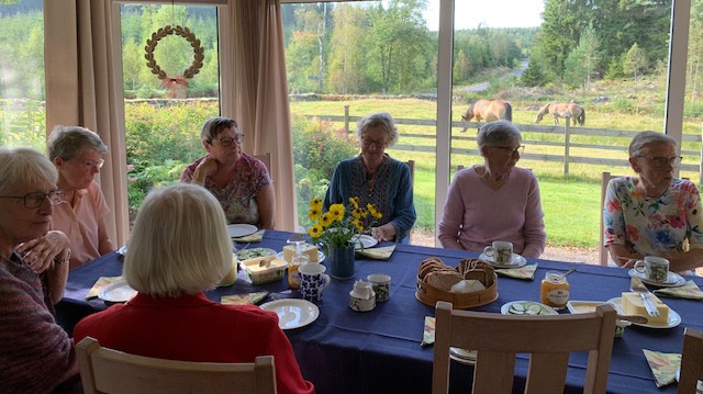 Jag tog bilder i motljus över kaffebordet med en så fin tavla utanför fönstret på hagen med stengärdesgård och två präktiga ardennerhästar. Finns det någon vackrare bakgrund. Ursäkta att mitt fokus var mer på hästar än tanter. Tack Inga-Lill för gott fika.