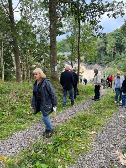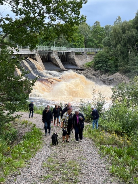 Vilken ljuvlig kväll vi fick vid Ätraforsdammens strand. Inte mindre än 52 st SPF-are mötte upp och Arne Brolin hade som vanligt eldat länge för att få rätt glöd på grillen. När magen fått sitt hade Marianne Andersson frågor om gamla idrottslegendarer utefter en liten slinga ner mot forsen som brusade mäktigt efter allt regnandet.
