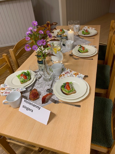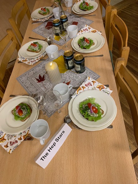 Borden var smyckade med höstastrar, vackra löv och små pumpor när vi bjöd in till pubafton. Varje bord hade skyltar med ett popband sen 60-talet. Där skulle sen tre stycken gängmedlemmar placeras, för -och efternamn paras ihop. Det blev lite rörigt ett tag, men avsikten var att åstadkomma en stunds trevligt mingel.