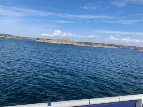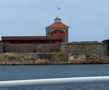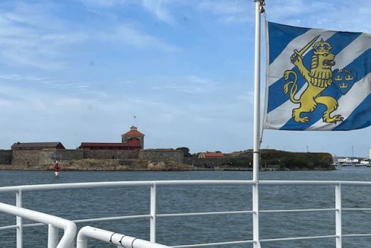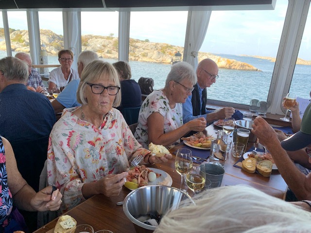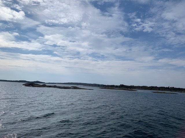 I strålande vackert väder stävade vi ut i Göteborgs skärgård. Vår faktaspäckade guide berättade om öarna vi passerade och mycket historik om byggnader, krig och kungar. Tyvärr är min hjärna av teflontyp så det är inte mycket som fastnar. Hon berättade om Gustaf II Adolf som grundade Göteborg 1621, då var det 5 portar i stadsmuren som stängdes om natten för att slippa obehagliga överraskningar, som dom hemska danskarna.