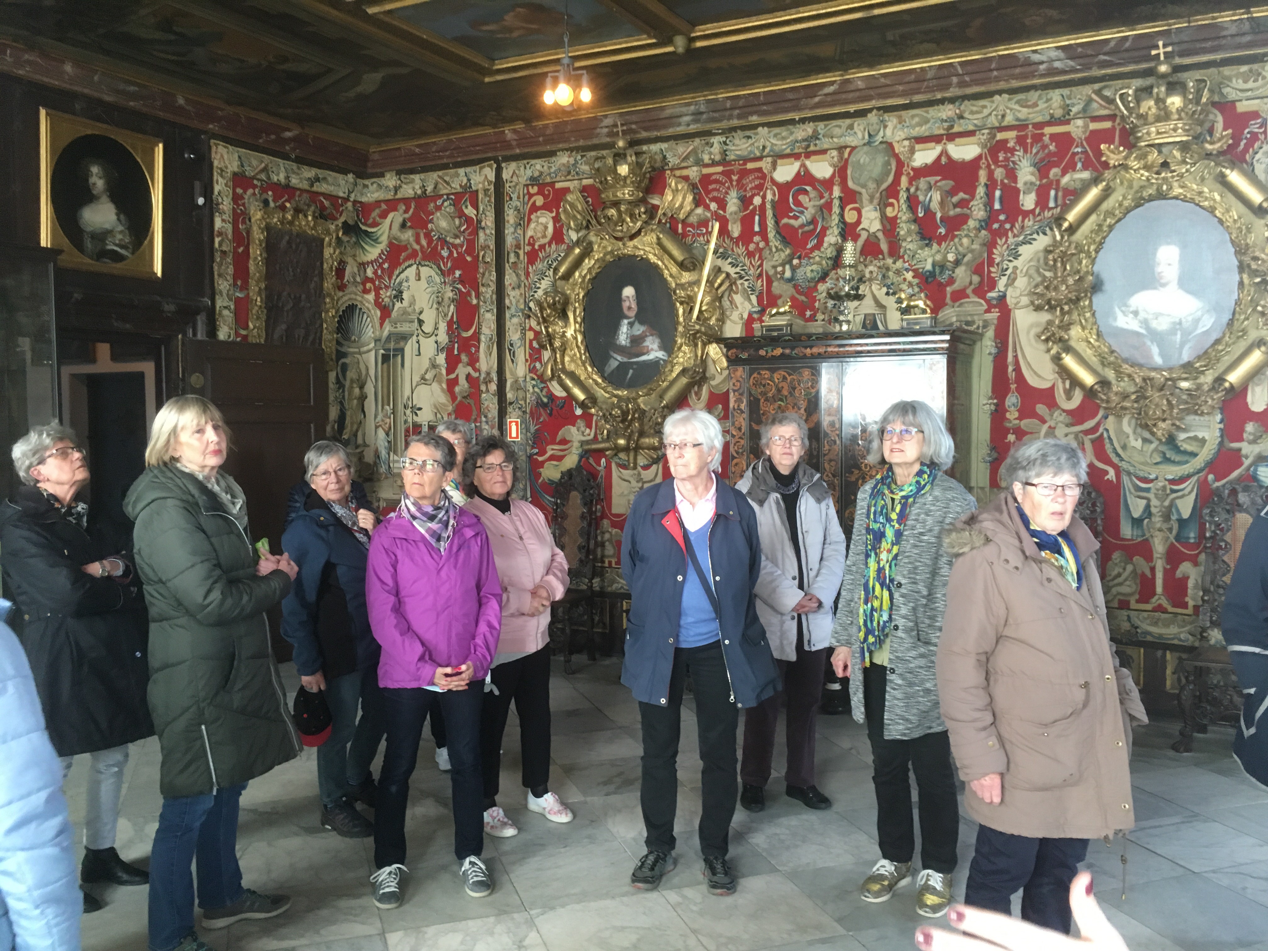 Vi fick korsa Pile Alle (starkt trafikerad), men kunde sedan äntra bussen och köra in i centrum igen till Rosenborgs Slott, den namnkunnige kung Christian IV.s favoritslott (dog här 1648). En stor upplevelse med besök i Skattkammaren. Vi såg bl. a. Christian IV.s praktfulla kröningskrona och blev insatta i historien och bakgrunden av intresserade guider.