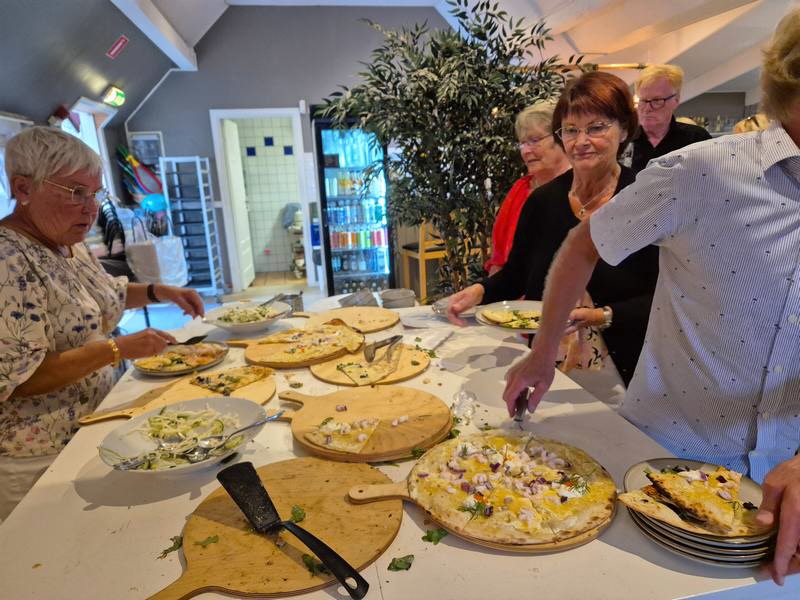En solig och varm augustikväll var det dags för pizzabuffé på Solstickan i Mellbystrand. Personalen kämpade med att baka pizzor i samma takt som de försvann från våra tallrikar, och det var inte lätt, eftersom 123 medlemmar gjorde vad de kunde för att tömma brickorna med pizzabitar så snart de var färdiggräddade.