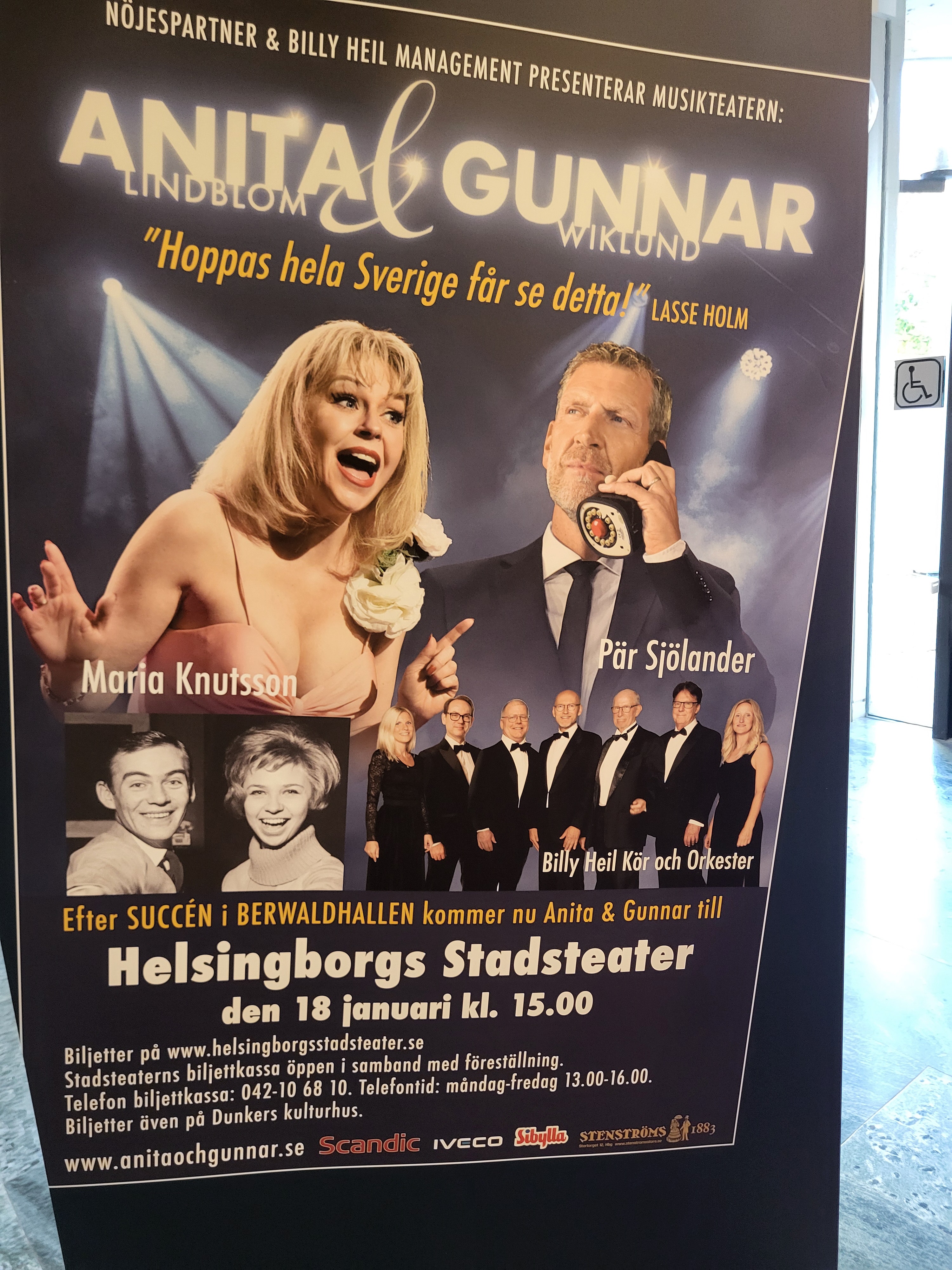 Ett femtiotal glada pensionärer åkte till Helsingborgs Stadsteater för att se succéföreställningen Anita & Gunnar. Föreställningen presenterades av Ulf Elfving, som först berättade lite om sina möten med svensktoppsartisterna Anita Lindblom och Gunnar Wiklund. Musikteaterföreställningen "Anita & Gunnar" beskriver ett fiktivt möte dem emellan i "efterlivet" där de sjunger många av sina hits och även har en dialog om sina karriärer, liv och kärlek. Anita & Gunnar gestaltades av Maria Knutsson och Per Sjölander och Billy Heil kör och orkester.