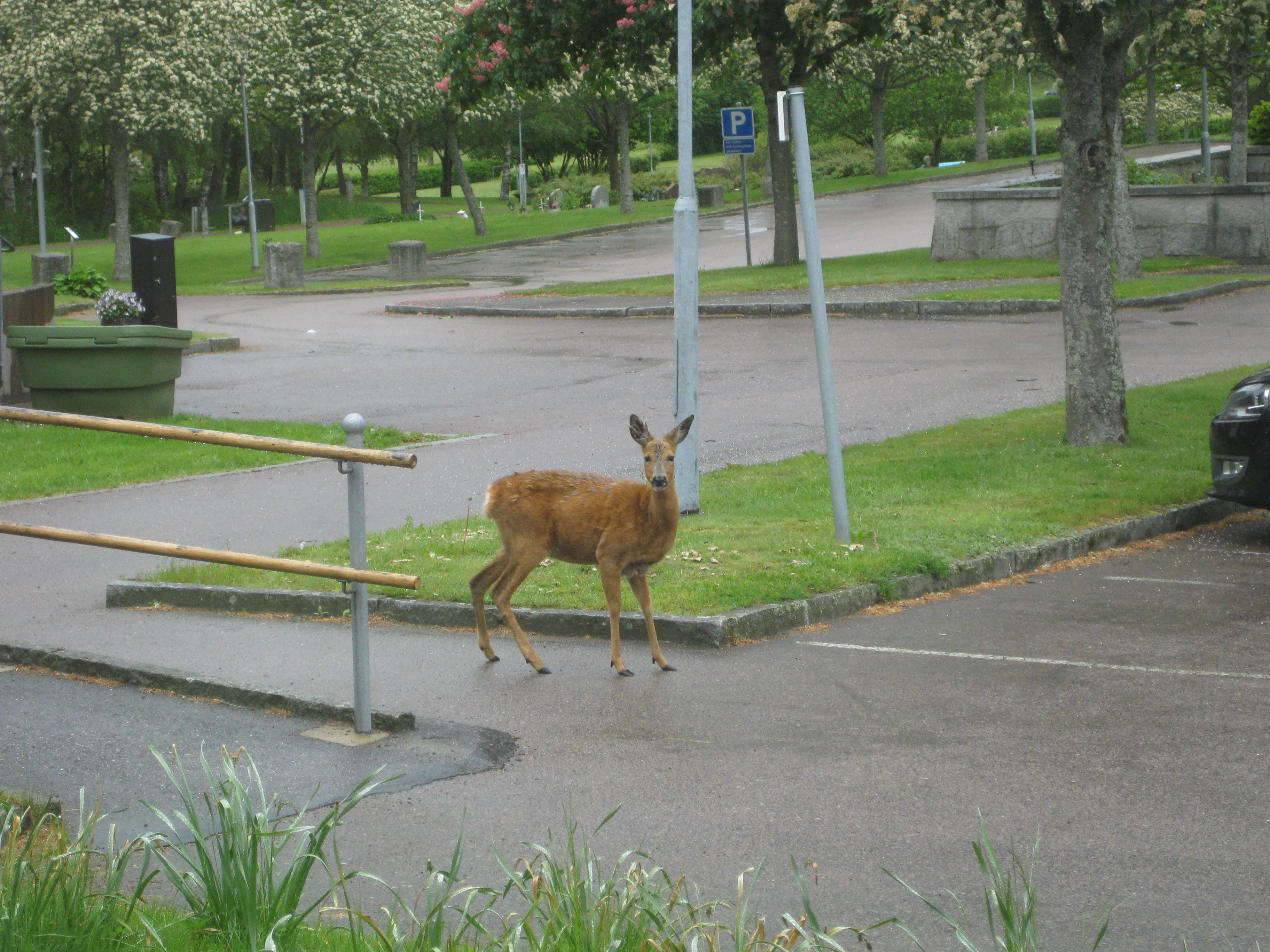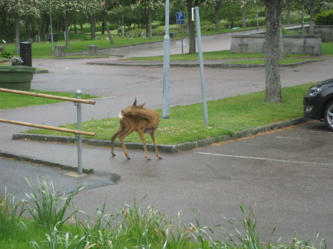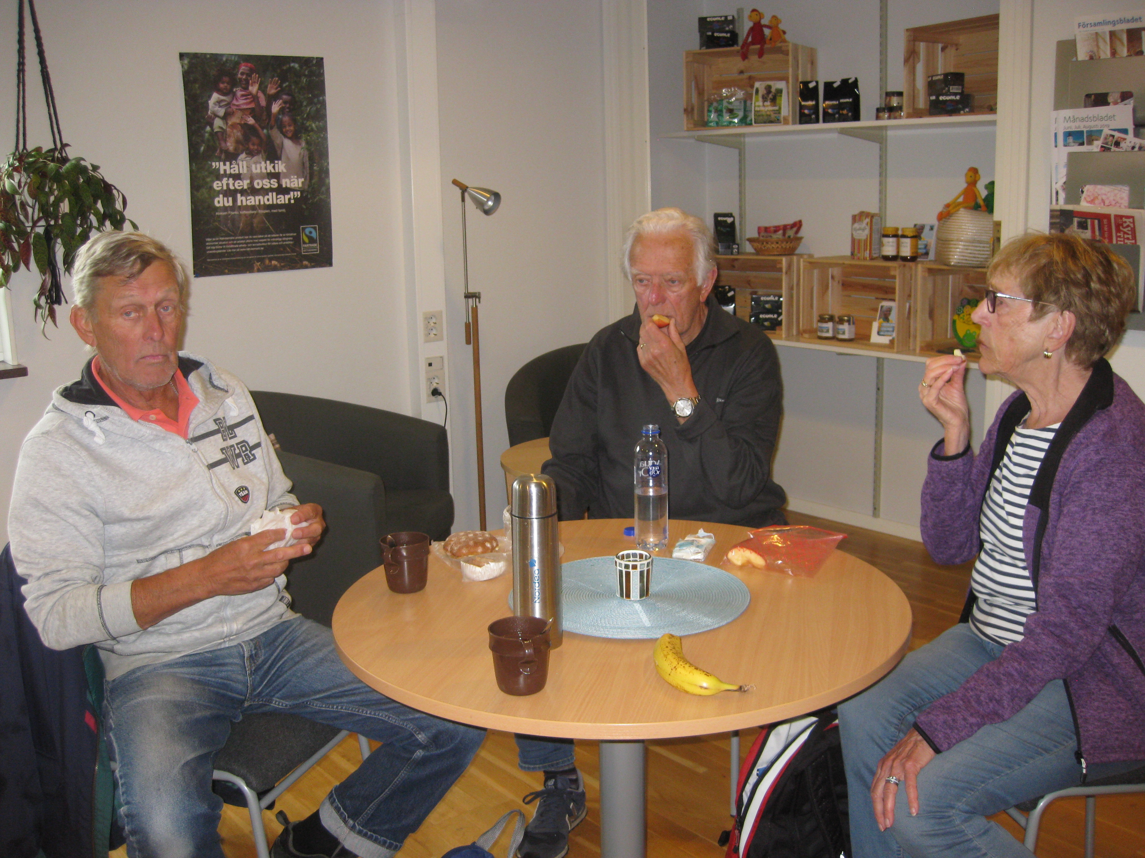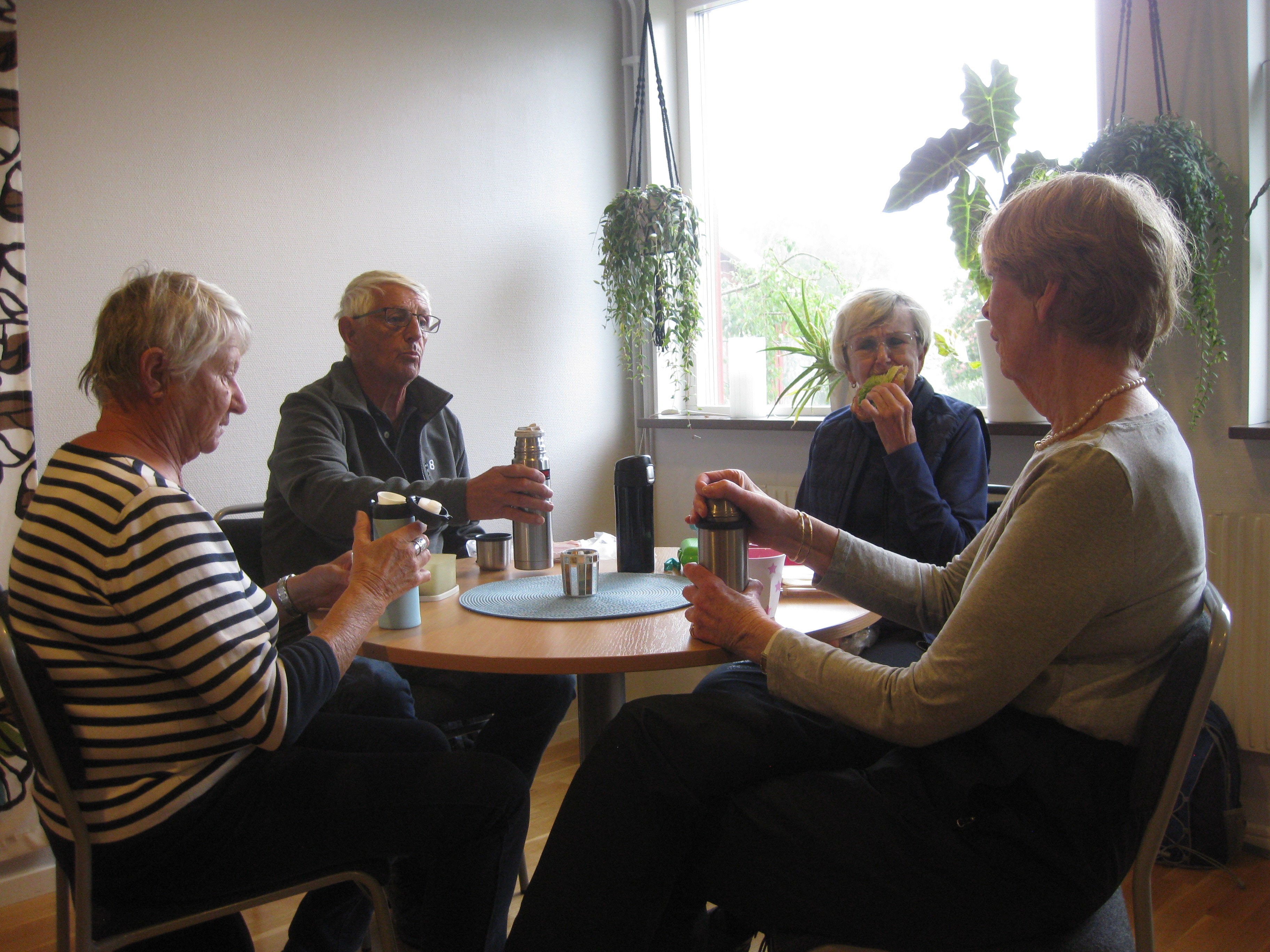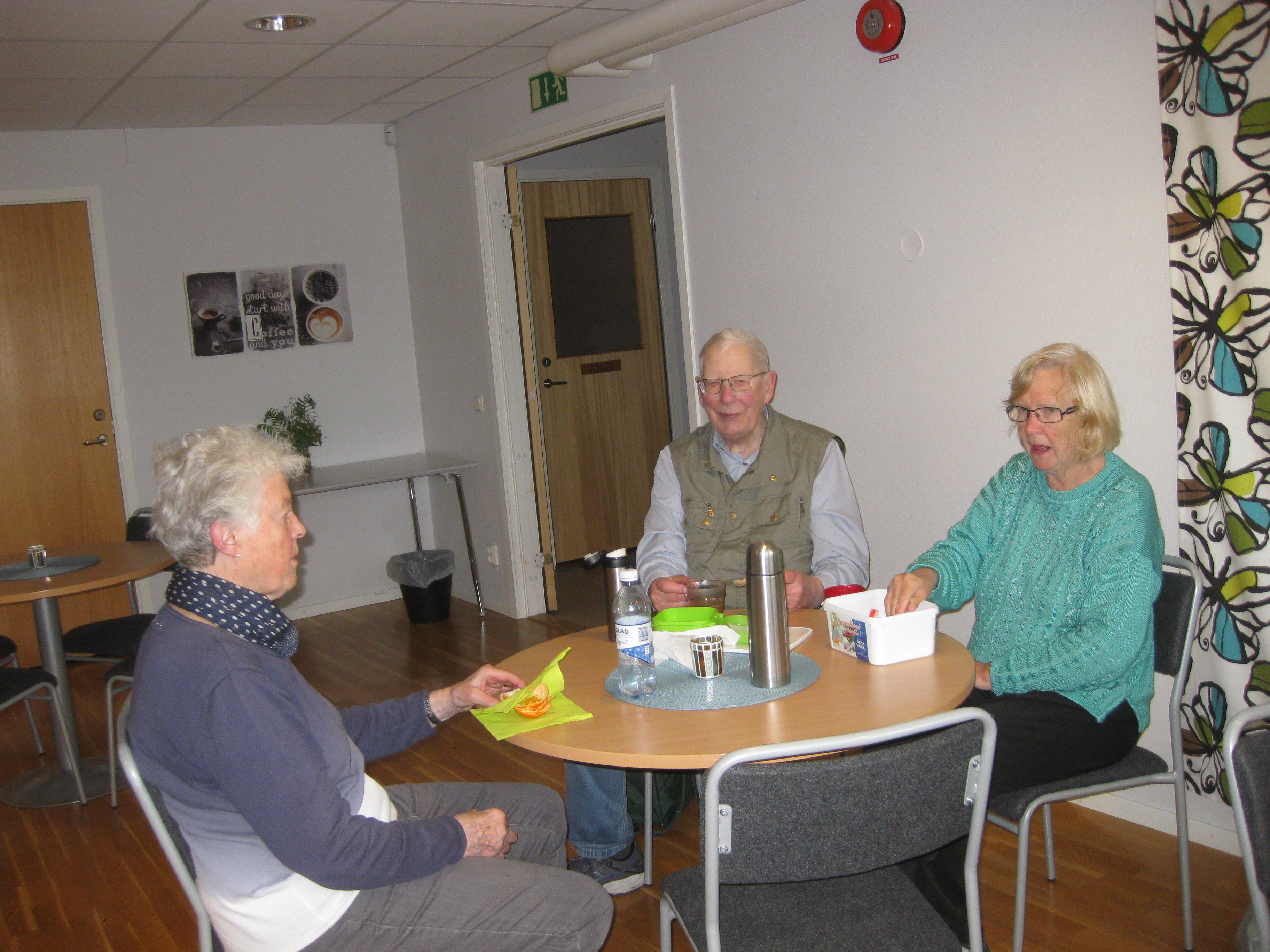 Promenad 2019-05-27 Tölö i lite småregn och därför fika inomhus i församlingshemmet och titta vad vi fick se alldeles utanför fönstret.