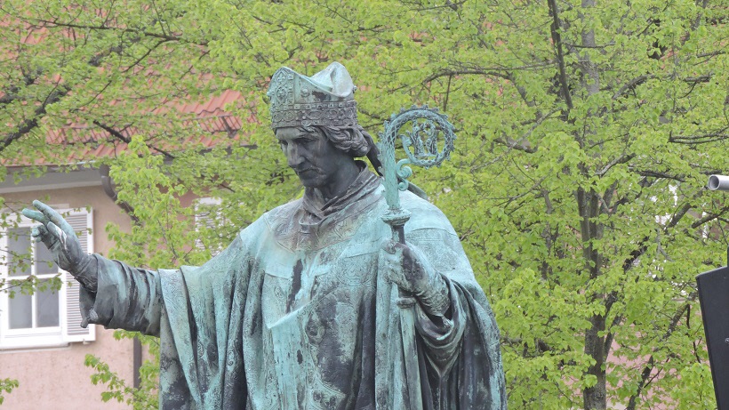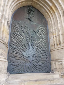 Bronsdörren, beställd av biskop Bernward (1015), med reliefer från berättelsen om Adam och berättelsen om Jesus Kristus.