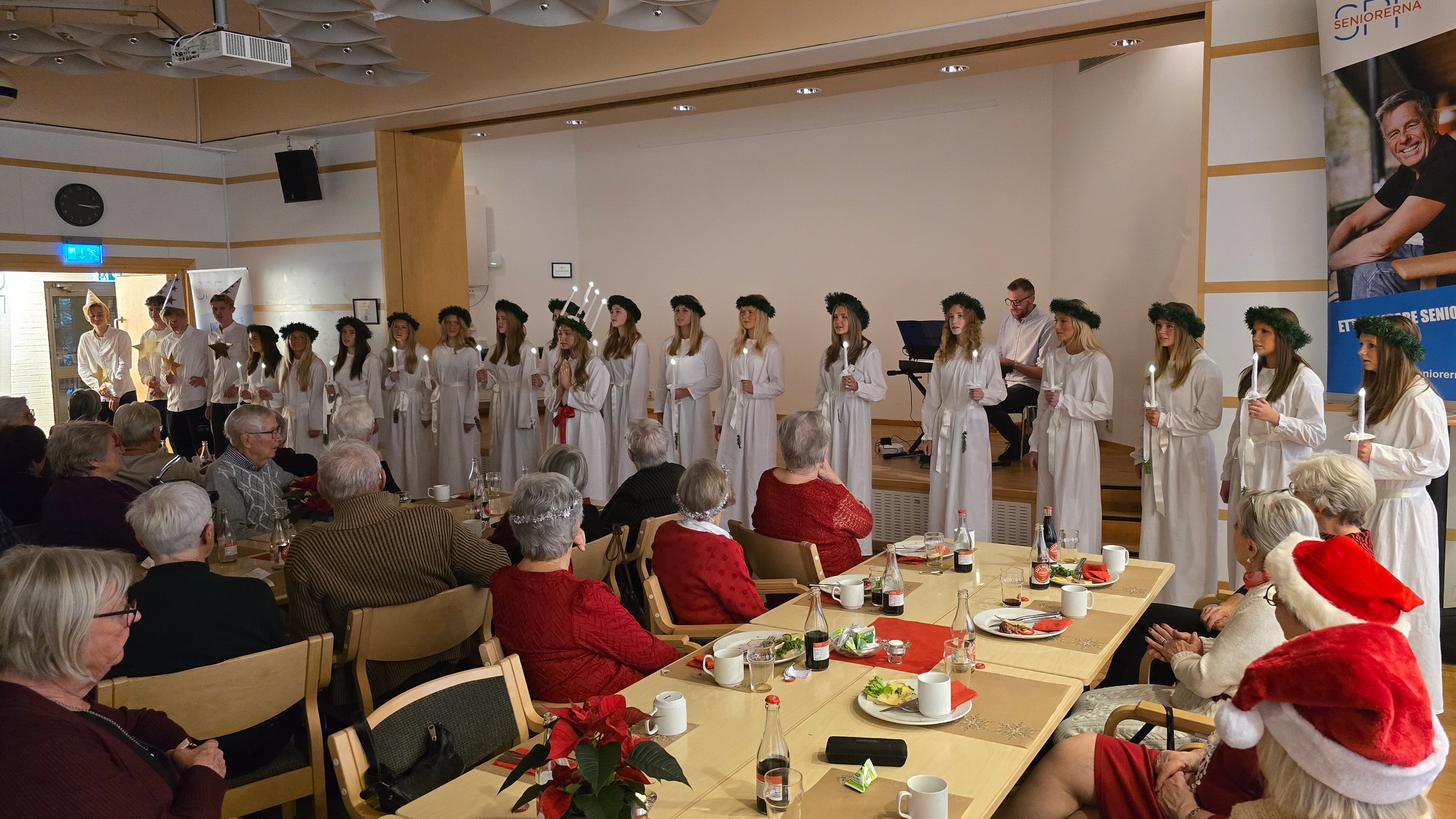 Strax efter kl 15.00 trädde Luciatåget in till släckt belysning och sjöng traditionella Lucia sånger - även fyra stjärngossar deltog.