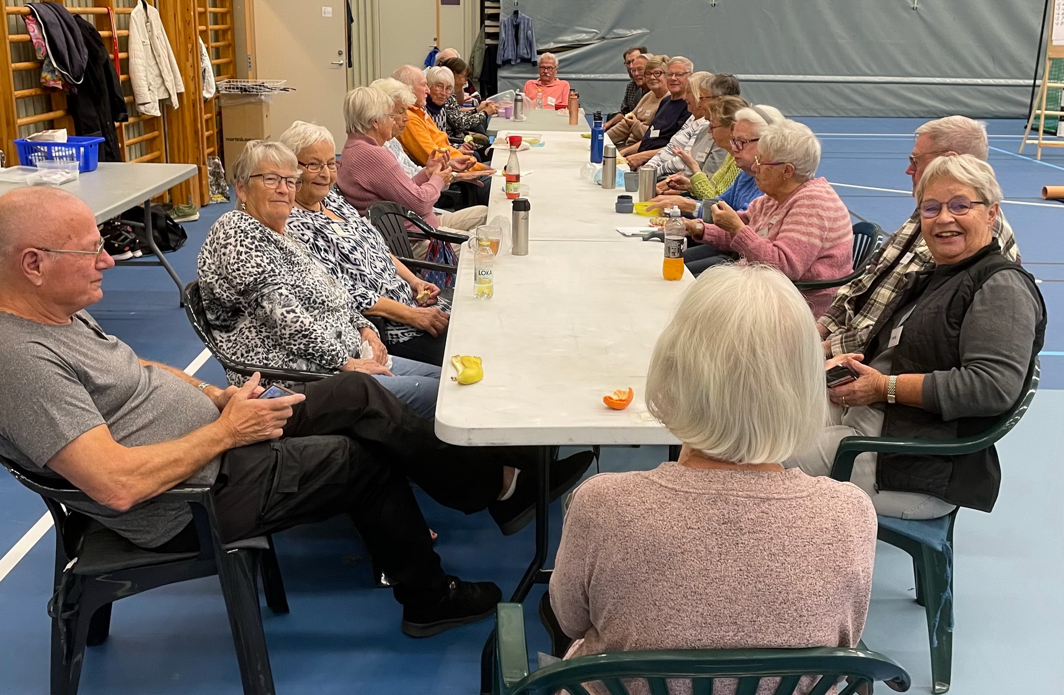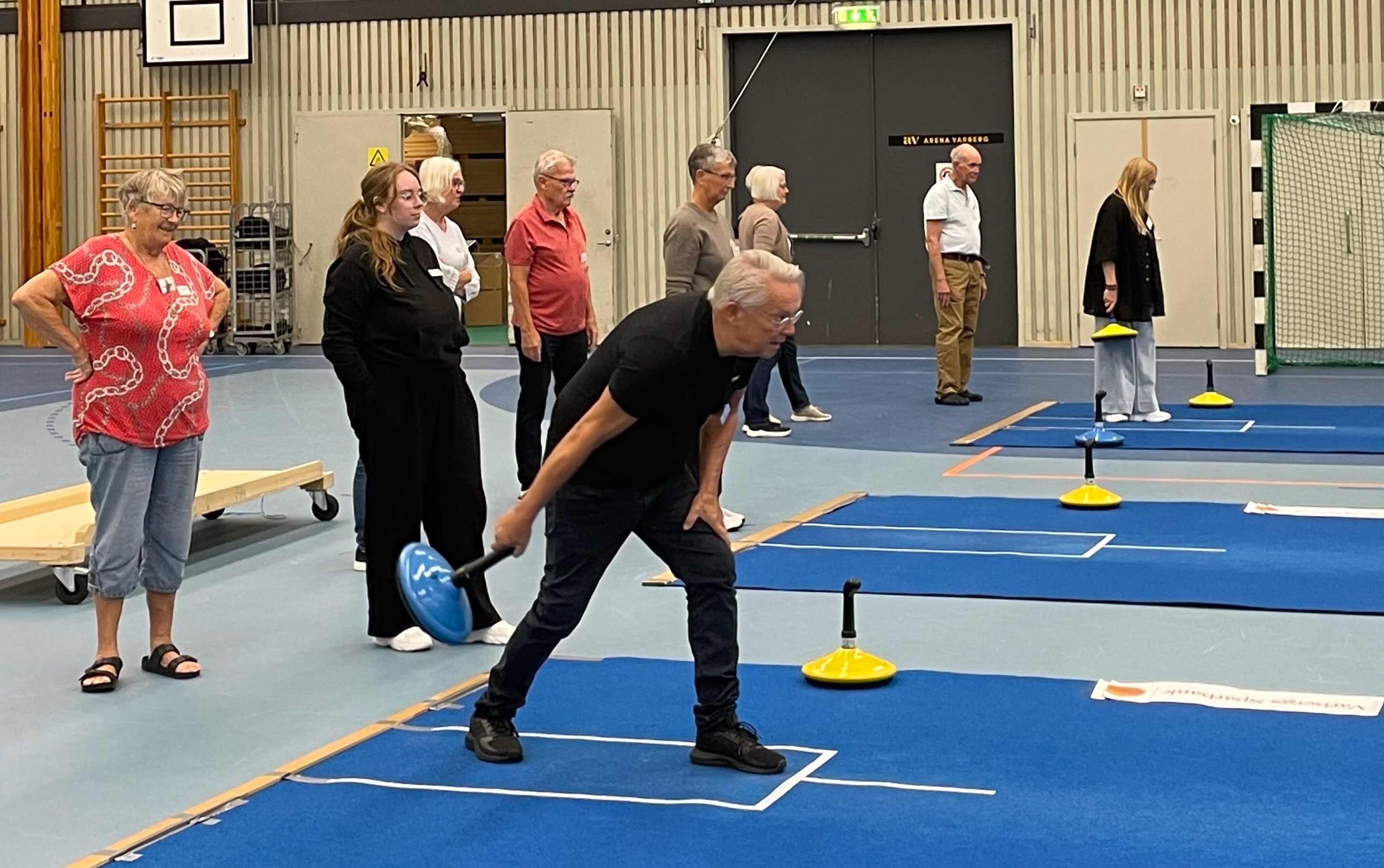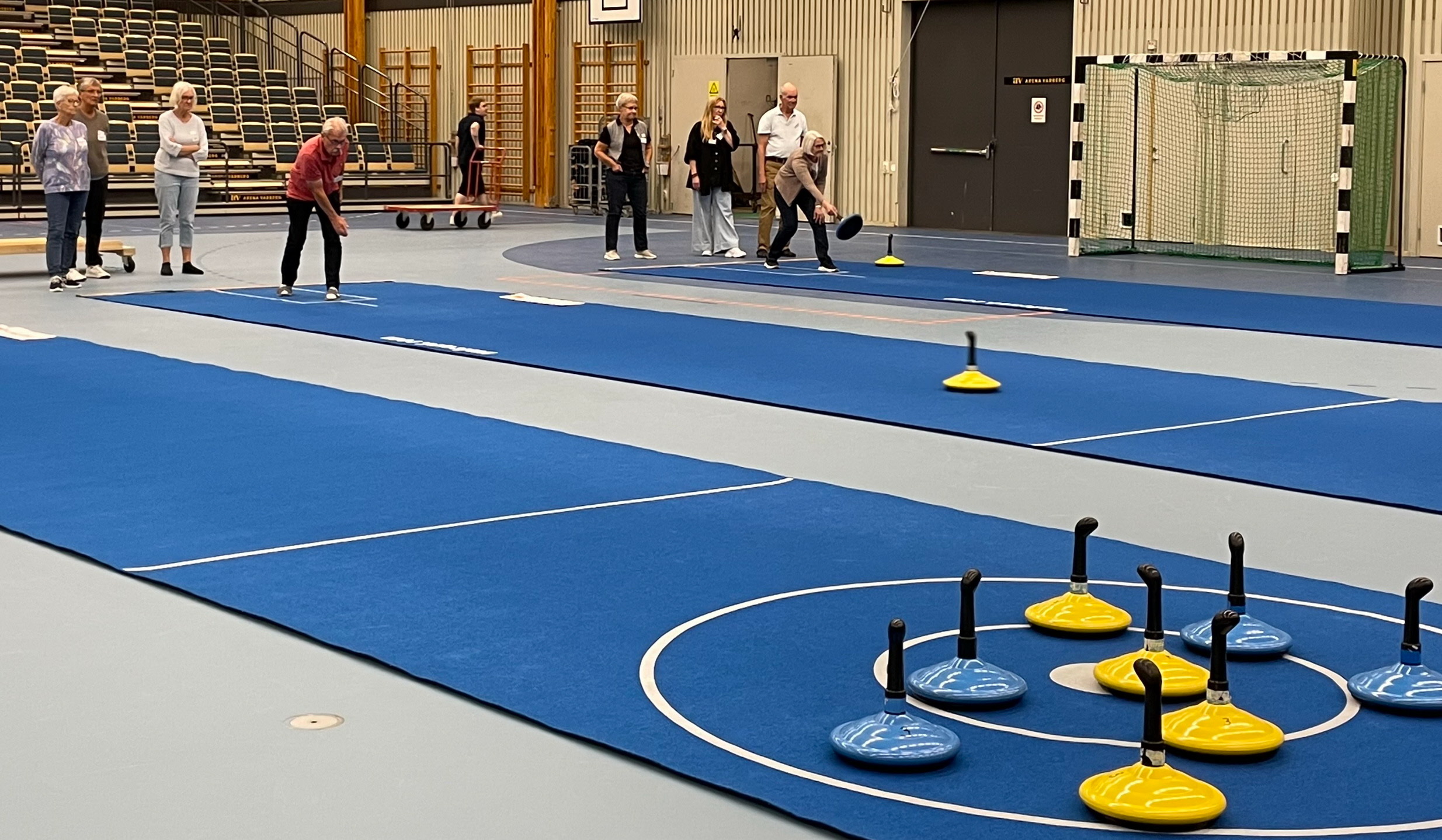 Ett glatt och aktivt gäng spelar mattcurling på måndagar