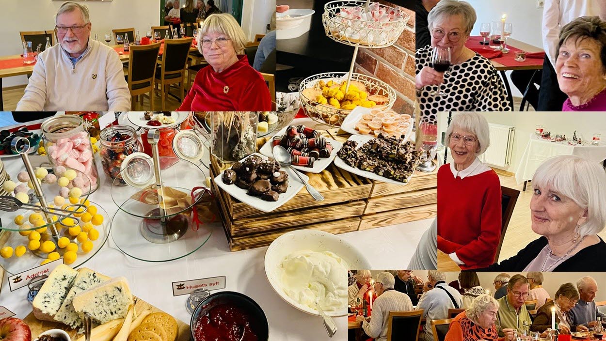 Vi var ca 60 personer som släpptes in till fint dukade bord med julanknytning. Efter beställning av dryck försåg vi oss med ägg, många olika sorters sill, potatis, lax av olika slag, bröd mm. Nu gällde det att äta sakta – ”magen blir fortare mätt än ögat”! Maten smakade fantastiskt! Sedan var det dags för julskinka, olika sorters kål, Janssons frestelse, köttbullar, revbensspjäll, prinskorv, omeletter och dopp. Mättnaden började så smått att infinna sig och det var dags för pauser i ätandet!