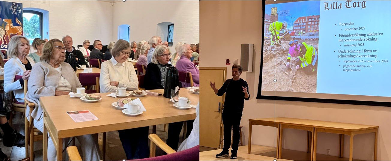 Föreningsinformation, höstens friskvårdsaktiviteter, information om kommande resor och studiebesök, fika och lottdragning med vinster. Sedan kom Johan Klange från Kulturmiljö Halland och pratade om de arkeologiska utgrävningarna på Lilla Torg under 2023 – 2024. Från de 121 gravar som grävdes ut kan man bl a få fram många uppgifter med moderna analysmetoder. En mycket intressant och spännande föreläsning!