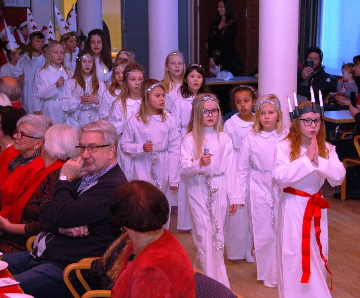 Ljuset dämpades och skön luciasång började höras från det luciatåg som närmade sig. Klass 3 från Stugsundsskolan under ledning av Carina Forsman sjöng många fina julsånger ackompanjerade av Peter Vosveld på piano. Att framförandet uppskattades av samtliga närvarande hördes av de applåder som inte ville ta slut.