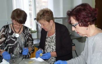 "Kökschefen" Laila Kvist med hjälp av Berit Lindholm och Lisbeth Karlsson arrangerar tapastallrikar till vinprovningen.