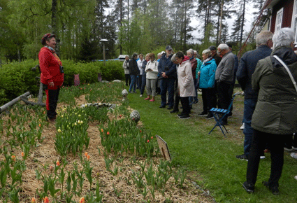 Där togs vi emot av Hasse och Carolina. Carolina har flyttat hit från Holland och var den som guidade oss runt. Företaget producerar över 100 000 tulpanlökar per år. På vintern kan man åka hundspann efter deras 35 Siberian Husky- hundar. Efter guidningen intogs en lunch bestående av grillad lax eller kött. Många köpte blommande tulpanlökar innan resan fortsatte mot ny sevärdhet. Läs mer om deras verksamhet på http://www.norrlandtulpaner.se