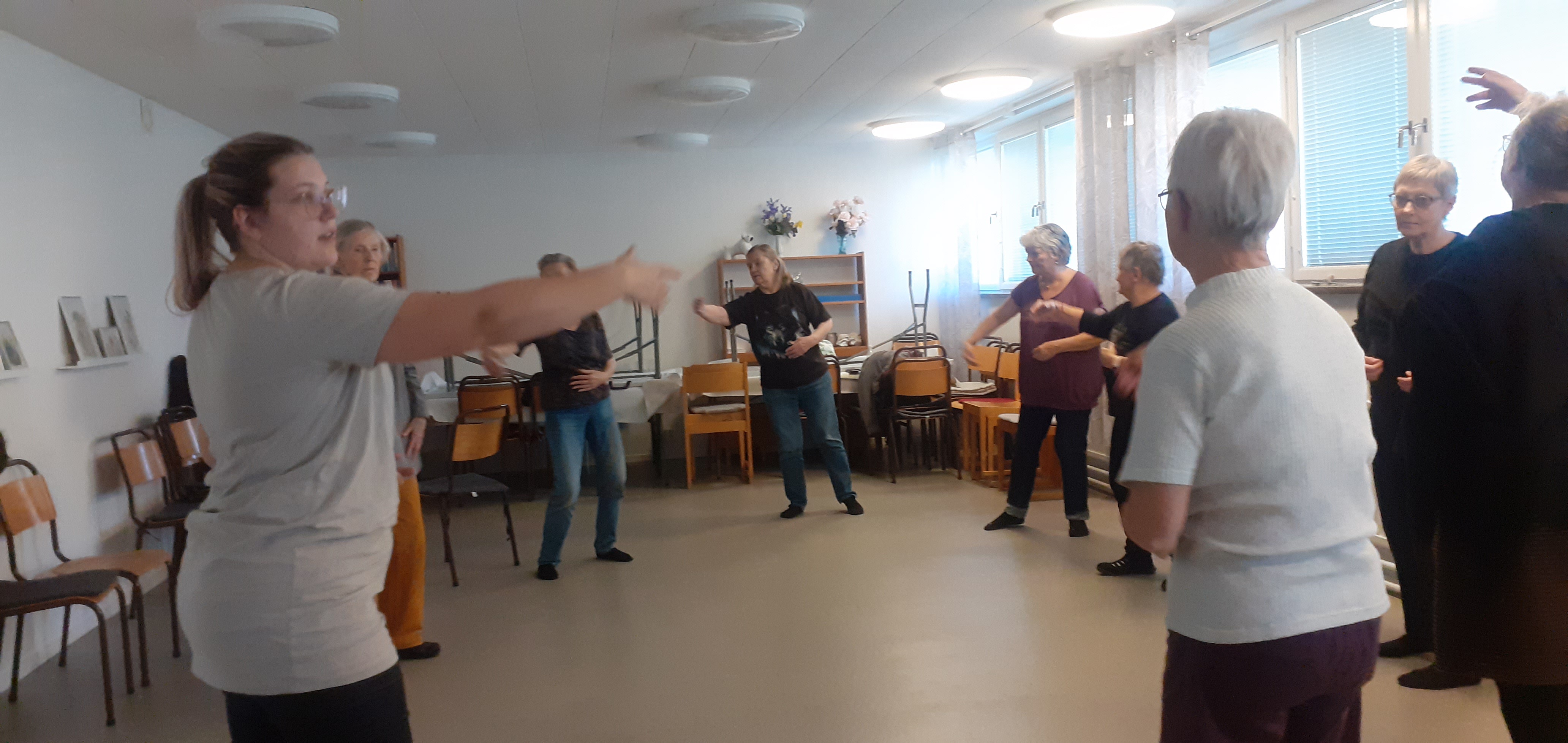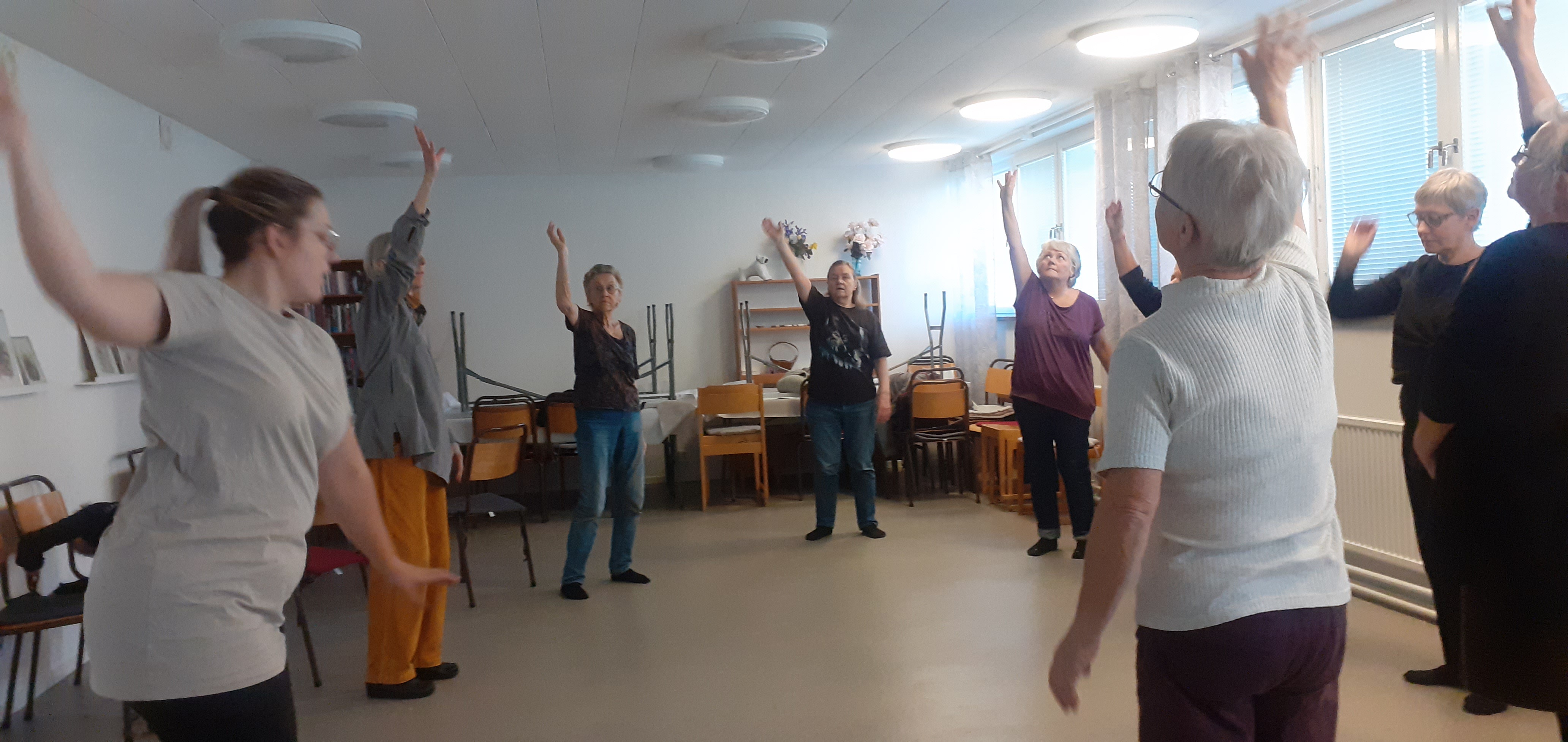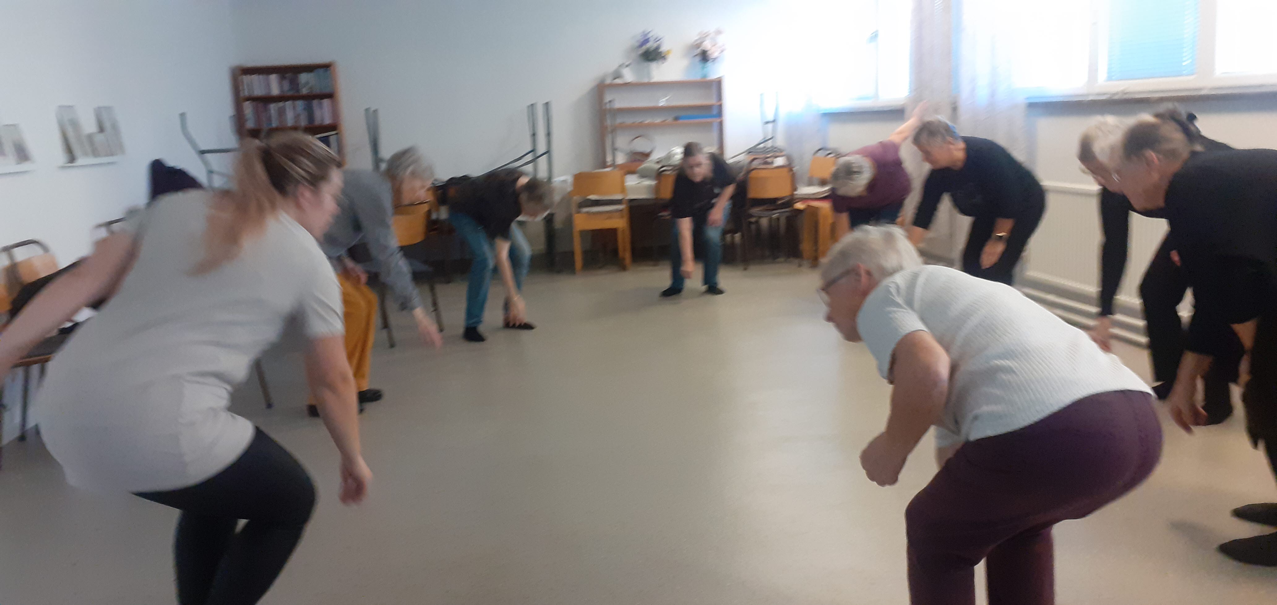 Idag, fredagen den 8 november startade dansen för fjärde terminen. Lokalen var fylld med danssugna. De flesta hade varit med tidigare men någon var ny. Agnes Krigh från Studieförbundet Vuxenskolan leder oss även denna termin. Det här är en dansform som alla kan delta i. Man kan delta stående, sittande eller tom liggande. Alla var vi överens om att man känner sig mycket piggare efter detta entimmespass med rörelser till musik. För denna gång är cirkeln fulltecknad men vi kommer att fortsätta efter jul.
