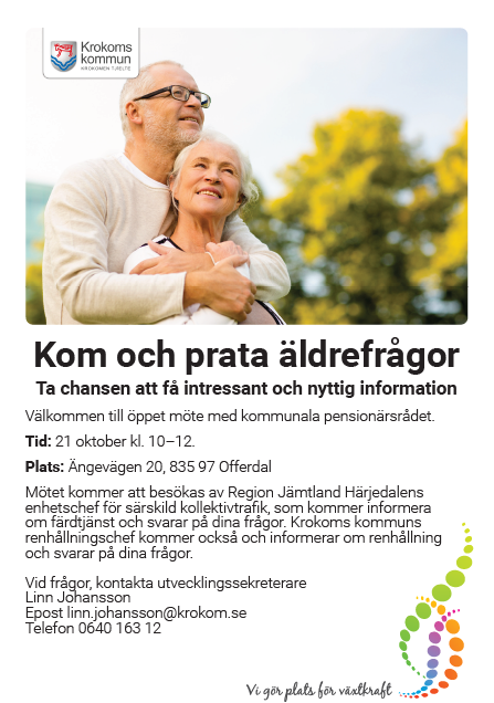 Mötet kommer att besökas av Region jämtland Härjedalens enhetschef för särskild kollektivtrafik, som kommer informera om färdtjänst och svarar på dina frågor. Krokoms kommuns renhållningschef kommer också och infonnerar om renhållning och svarar på dina frågor.
