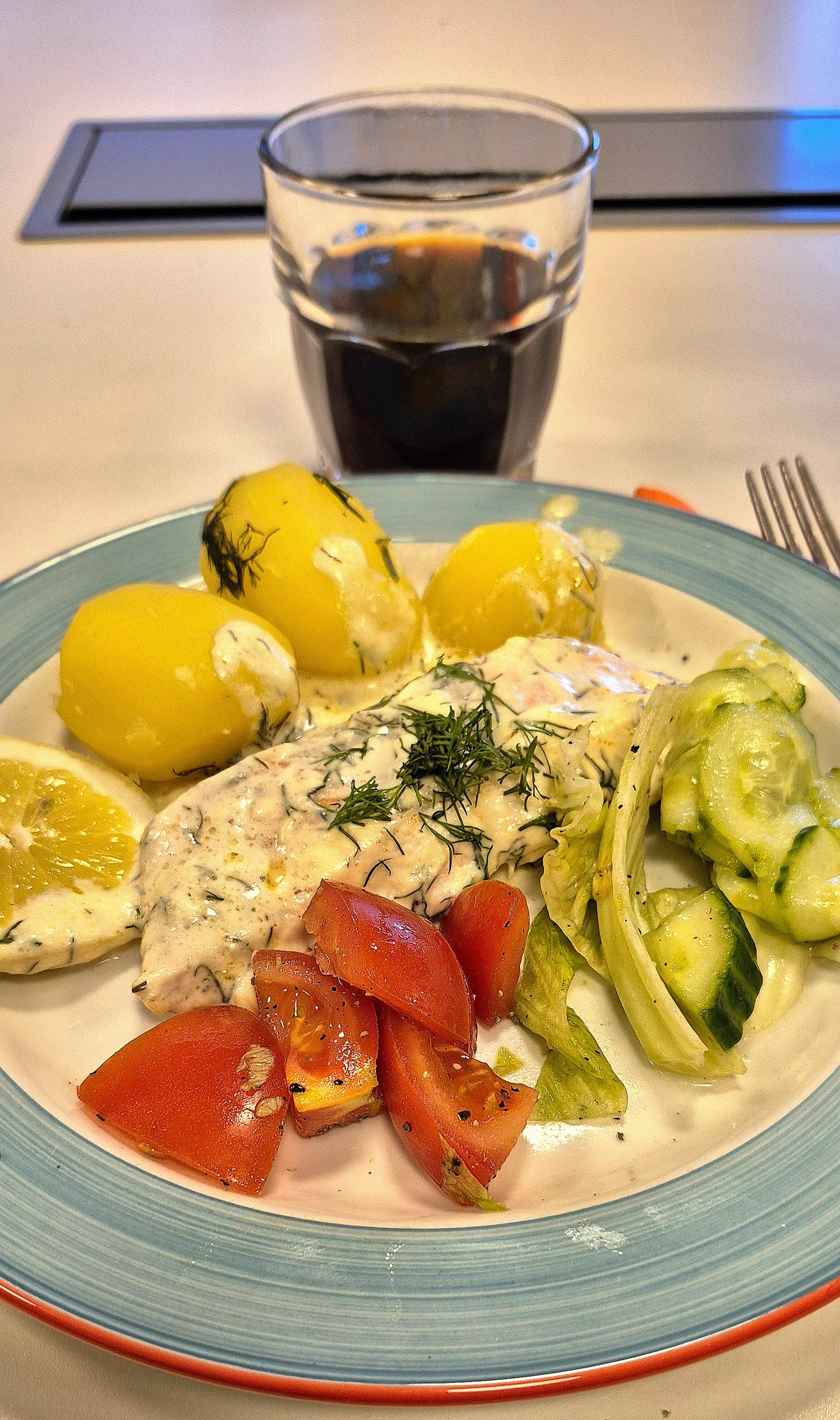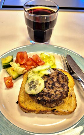 Bosse E kom med recepten. Till förrätt blev det älgfärsbiff på smörstekt formbröd. Huvudrätten var lax i ugn med kaloristinn sås, kokt potatis, inlagd gurka och grönsaker. Fantastiska rätter!