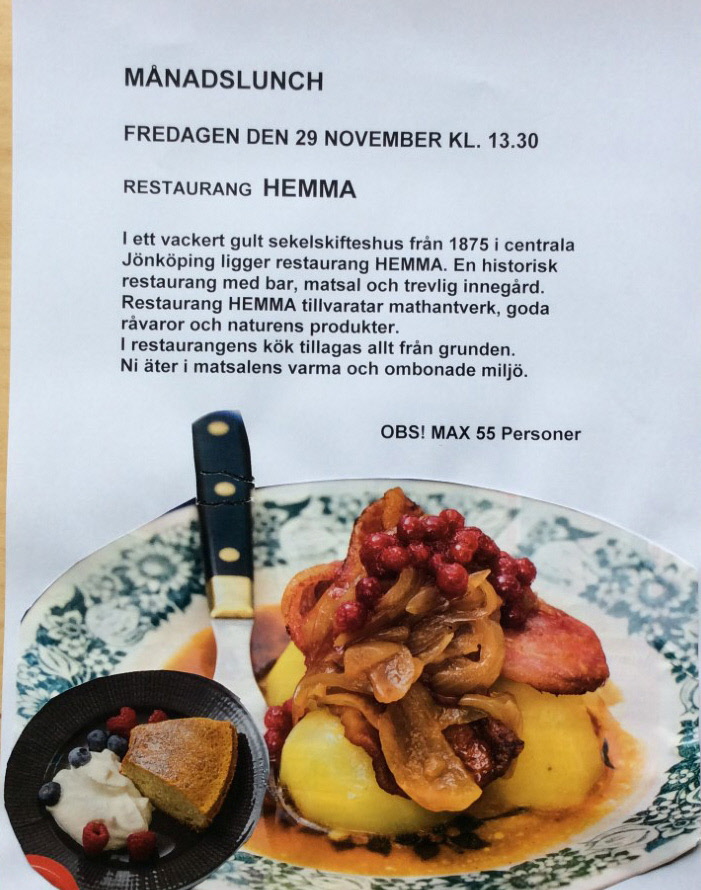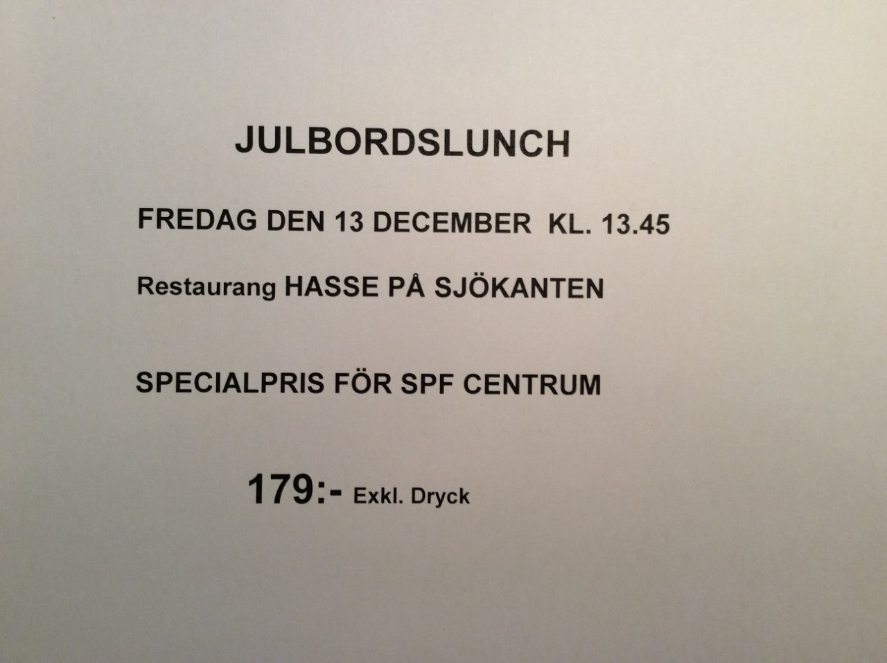 Månadslunch fredag 29 november på restaurang Hemma kl. 13.30 samt julbord på Hasse på Sjökanten kl. 13.45. Det är fullsatt men det finns väntelista. Kontaktperson Per Johansson tel. 070-170 55 53. OBS! Anmälan är bindande.