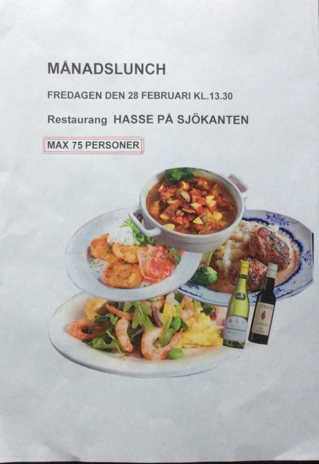 Nu har du möjlighet att anmäla dig till lunchen 28 februari på Lasse på Sjökanten. Anmäl till Per Johansson tel. 073-908 20 42 eller per.johansson036@gmail.com