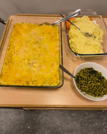 Kvällens receptmakare var Bosse och Magnus. Entrérätten var tonfiskröra på grovt bröd.Huvudrätten blev fiskgratäng med smörigt potatisstomp. Dessert, trots att magarna var välfyllda fanns det plats för sockerkaka med tjockt lager vispgrädde och jordgubbar. Därefter åter till köket för att fylla diskmaskinen, göra rent grytorna.
