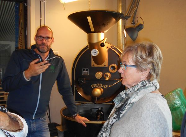 I lite grått sensommarväder åkte ett femtontal SPF:are från Jönköping Öster till Vistakulle gårdsbutik med gårdsrosteriet Vista där vi togs emot av Ingo Deters. Han berättade för oss att kaffe innehåller ett stort antal aromämnen och att kaffet smakar olika beroende på var det odlats, Syd- och Mellanamerika, Afrika eller Asien. Och det ska behandlas på rätt sätt och med respekt. För smaken är både rostningen och tillagningen a och o, rätt mängd, rätt vattentemperatur och bra vatten. En dödssynd är att brygga kaffe och därefter låta det stå på värmning tills kannan är tom. Ett gott kaffe ska inte vara för starkt och beskt utan smeka gommen.