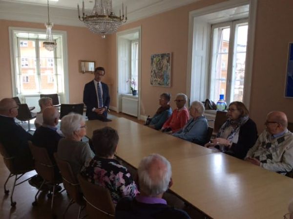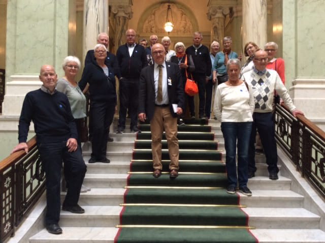 Måndagen den 8 maj åkte ett gäng glada SPF-are upp till huvudstaden för att göra ett besök i maktens boningar, nämligen RIKSDAGSHUSET. Väl framme mötte Jönköpings moderate riksdagsman, Sotiris Delis, upp och tog oss med på en tre timmars intressant rundtur. Det hela började med att vi fick träffa Ulf Kristersson, moderaternas ekonomisk-politiske talesman. Därefter besökte vi bland annat Plenisalen där några passade på att stå i talarstolen, och pressrummet där alla presskonferenser sker. Sotiris berättade kunnigt och engagerat om husets historia. Västra riksdagshuset, nuvarande Plenisalen, var tidigare Riksbankshuset men byggdes om i samband med införandet av enkammarriksdagen.