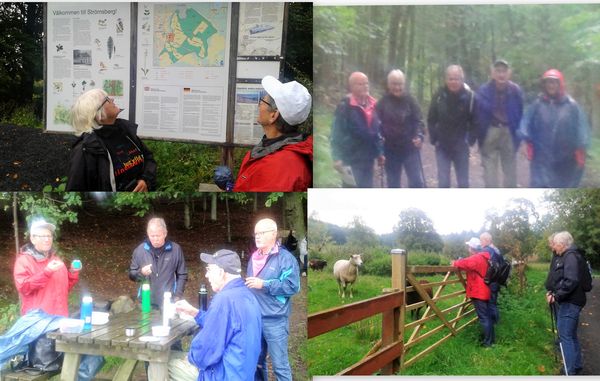 Onsdagen den 13 september trotsade ett tappert gäng från SPF Öster vädrets makter och tog sig till Strömsbergs naturreservat. Det var ömsom regn och sol, ömsom upp och ned och ömsom torrt och lerigt. Precis när vi skulle fika gjorde regnet ett uppehåll. Det är ett välkänt faktum att ett fika aldrig smakar så gott som ute i naturen. Vi passerade bastanta askar, en bokdunge, stora ekar och bäckraviner. Vi besökte även dammen i södra delen av gårdsområdet. Humöret var på topp och sällskapet trivdes.