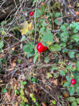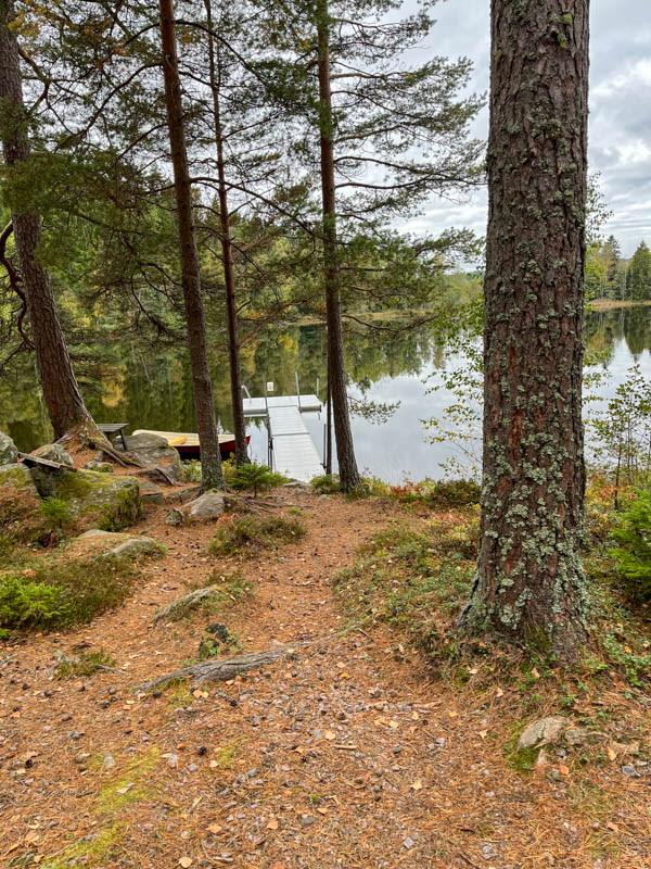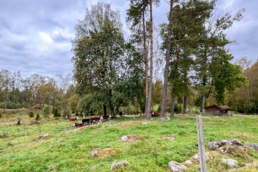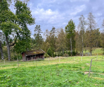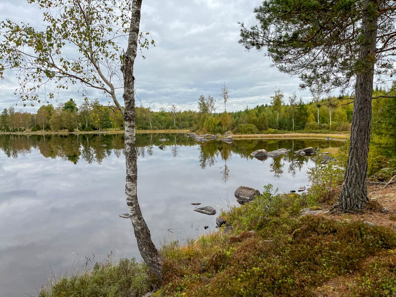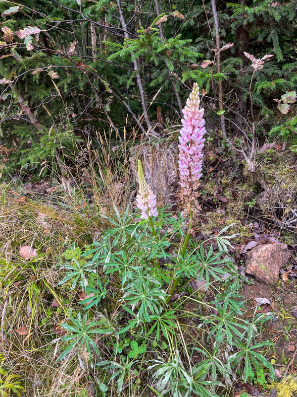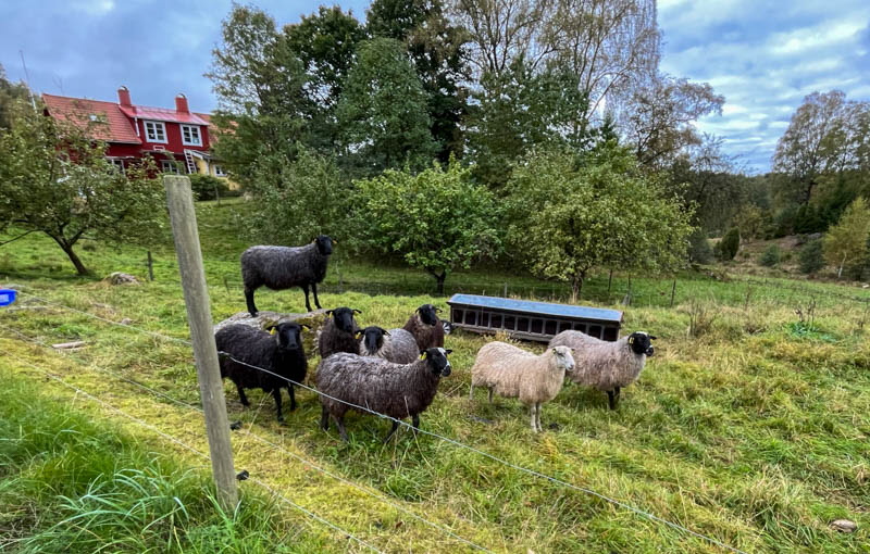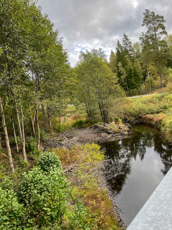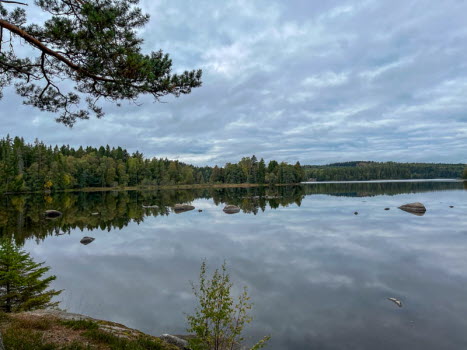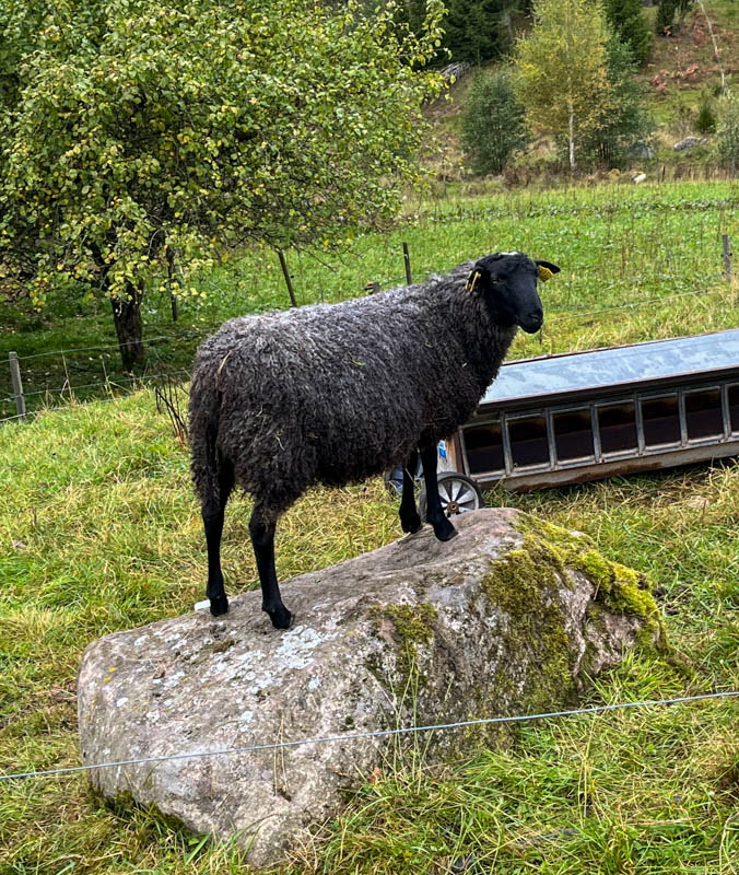 I Bjättebo stod svarta fåret på en sten och gjorde sig stor. Längre bort betade korna. Riktigt röda nypon lyste upp. De har byggt en brygga men vi fortsatte till vår vanliga fikaplats. Det är lågvatten i Brängen om man jämför med förra året. Det växer kråkris vid en tall och lupiner blommar. Även Tidan har lite vatten.