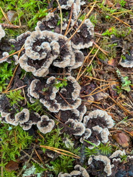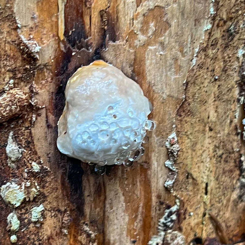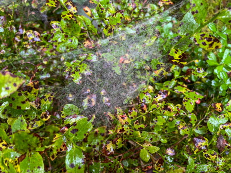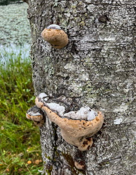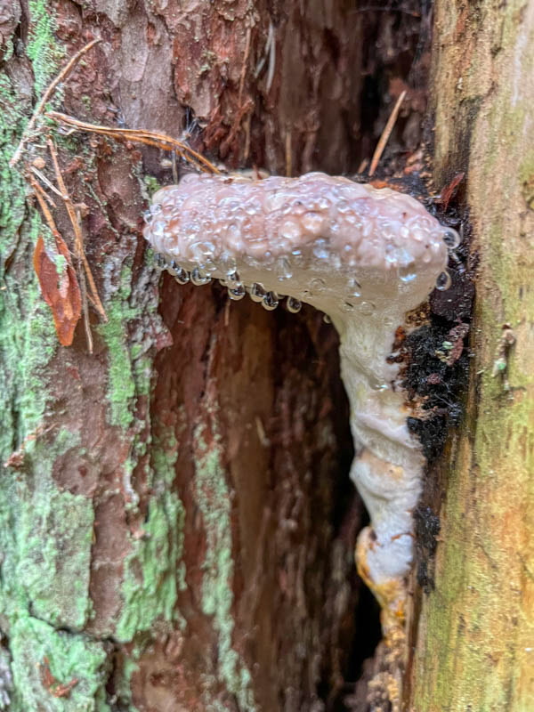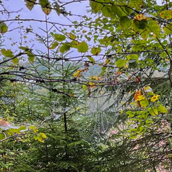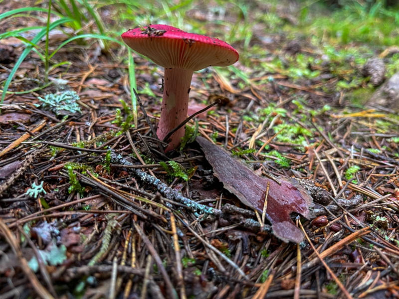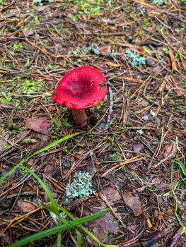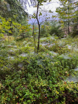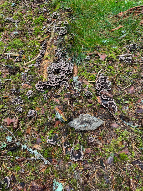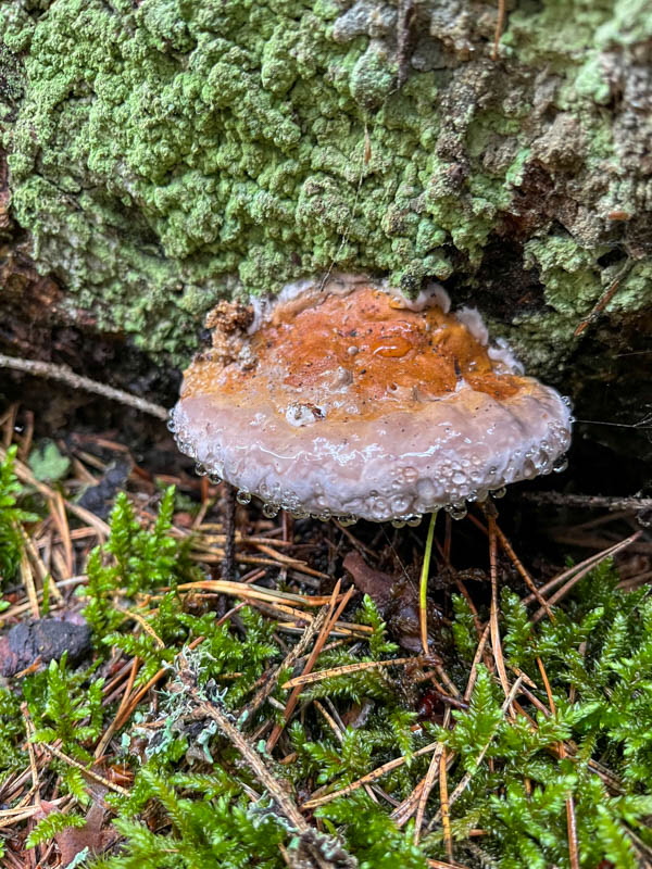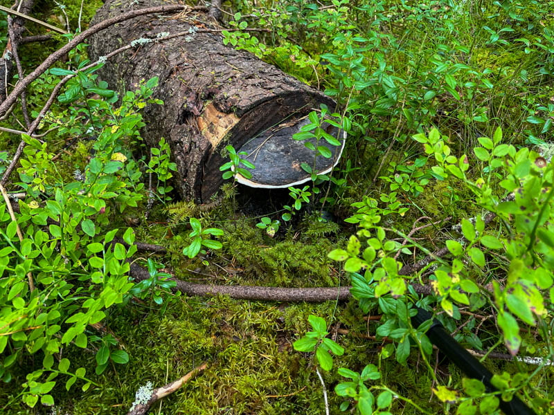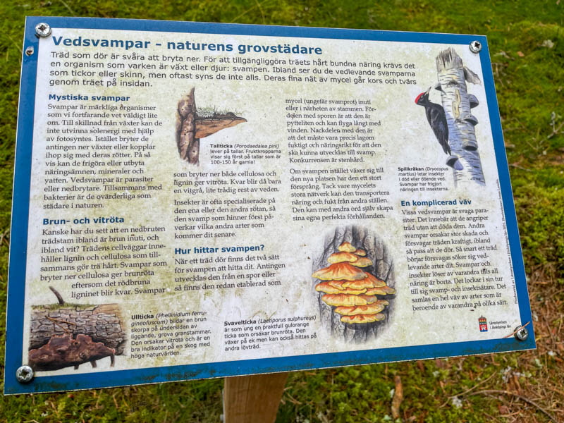 Det finns nya fina informationsskyltar på flera ställen. Har ni sett tårticka? Det såg vi 3 stycken på en död stam och en bit ifrån såg vi vårtöra som är en annan nedbrytning svamp. Det finns mycket spindelnät i skogen nu. På en björkgren var ett snyggt nät men svårfångat. Så var det svampar igen. En annan ticka och en rödkremla enligt google. Lite jobbigt att fota skivor under hatten men det gick utan att ligga på magen.