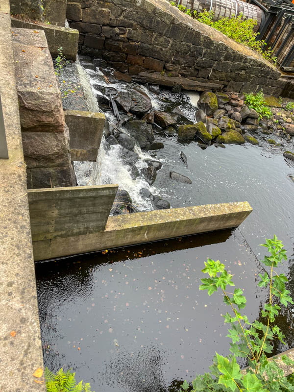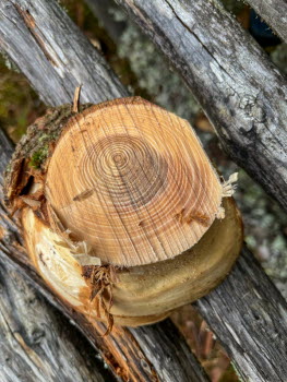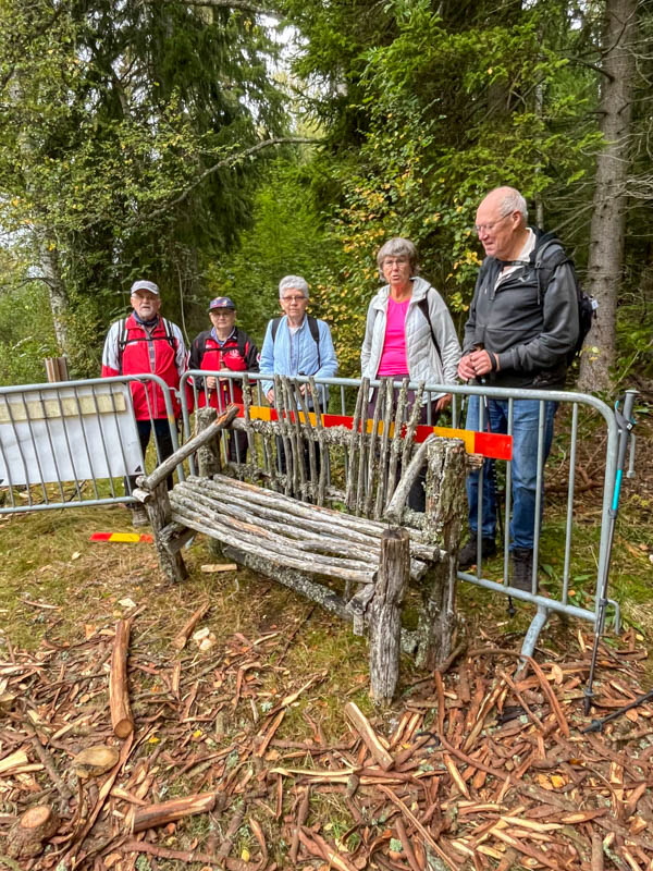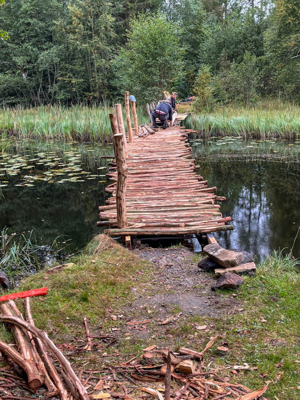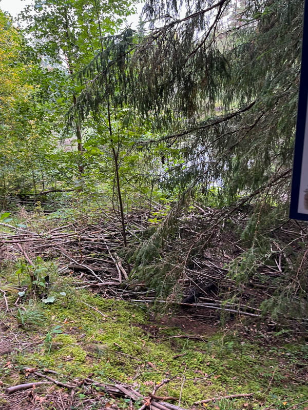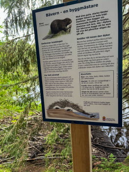 Information om bävern vid bäverbygget. Spännande att se hur de jobbar med pinnabron. "Pinnarna" är grangrenar. En gammal gran. Det finns en stor gammal gran som har döttrar kring sig. Grenar som har många årsringar håller mycket längre än slanor trån unga granar som kanske vuxit i 20 år. Ganska lite vatten i Tidan nu.