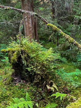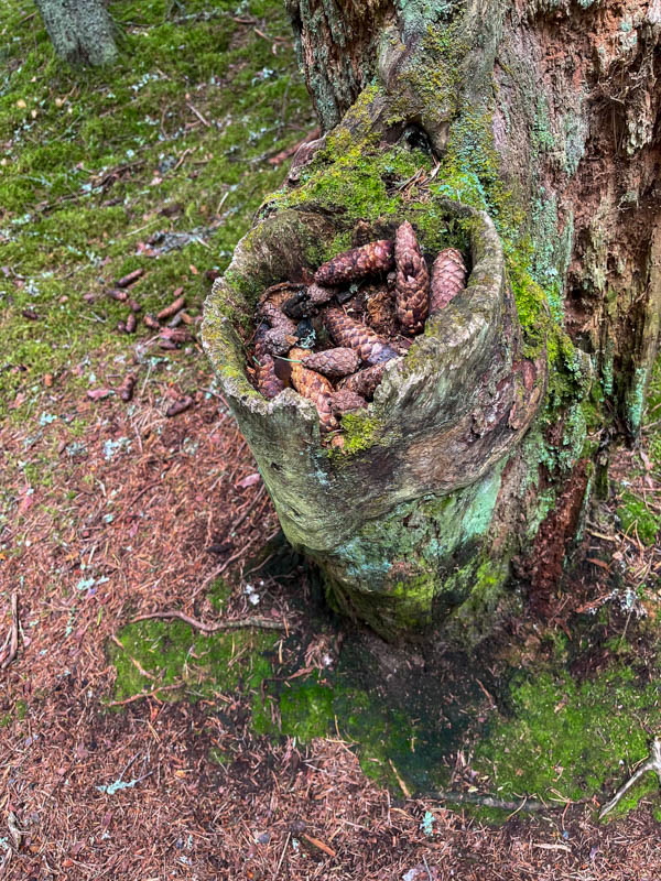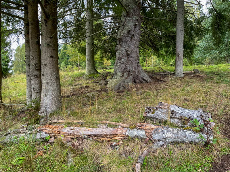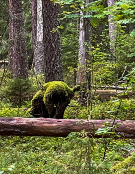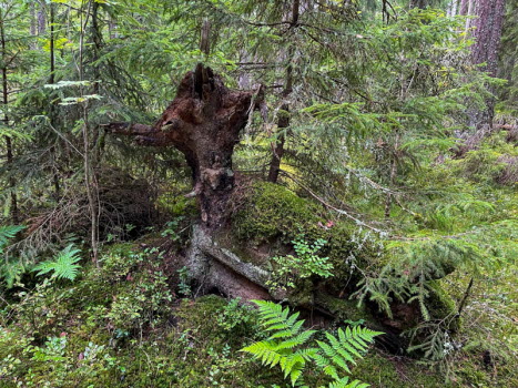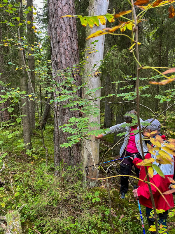 Det blev Gammelskogen denna gång. Inte så långt men mycket att titta på. Det är vackert med alla stammar men mossa. Två stammar intill varandra varav den ena är torr. Det går att hitta mycket i skogen. Jag har fotat en hund många gånger, men nu bara skelettet kvar och är det en gitarr eller björn där borta? Eller det kanske är en elefant...