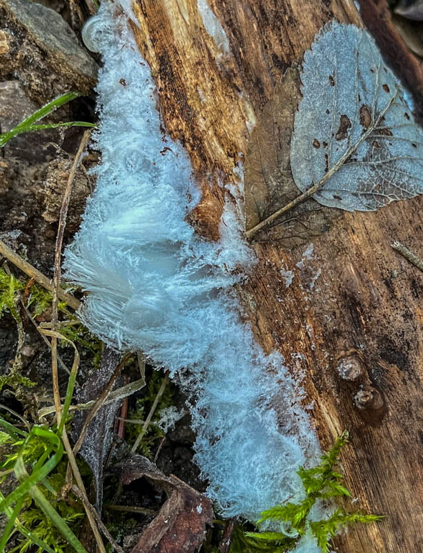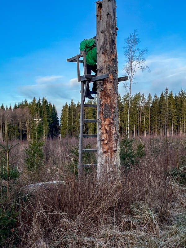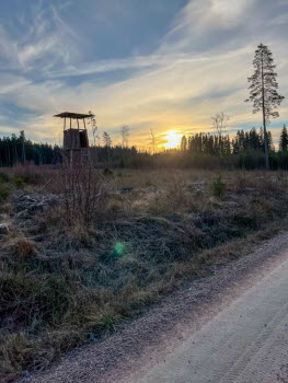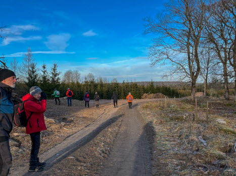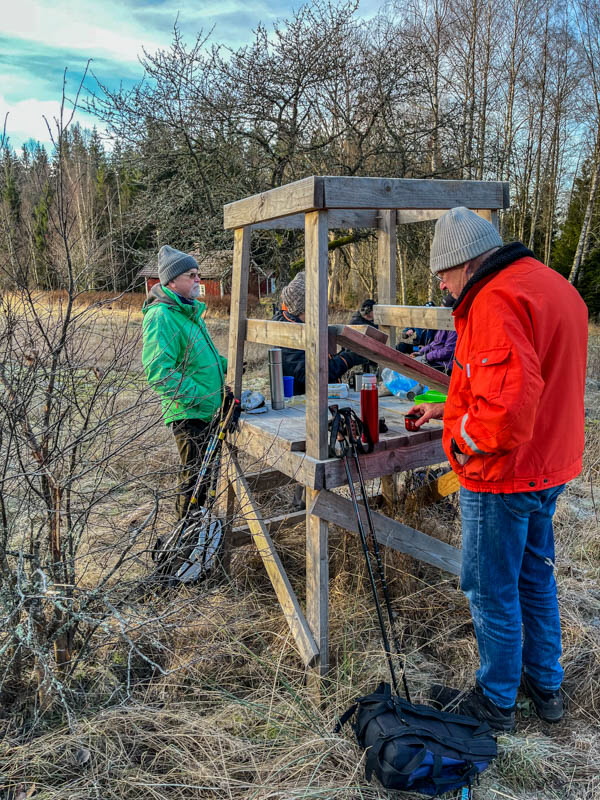 Vi startade vid maskinhallen Lockås och gick mot Hallarödjan. Vi skickade upp Arne för att kolla utsikten från jakttorne. Vi såg frusna älgspår på flera ställen. Vi hittade håris där det gick att se att det var hår eller vätteskägg. Vi passerade Ranten och Björkeskog innan vi kom fram till Hallarödja för fika. Vi hade ett fint fikabord i rätt höjd.