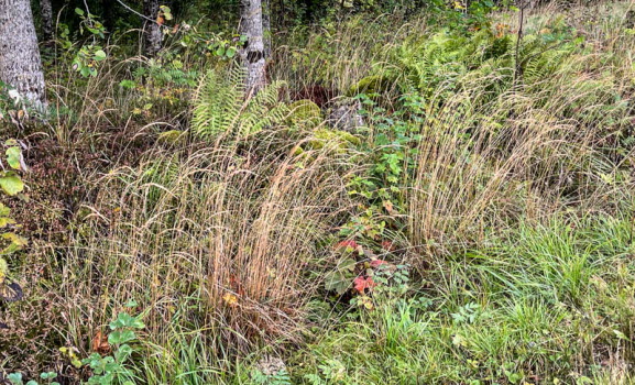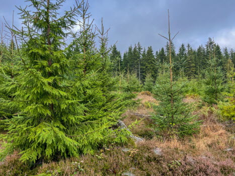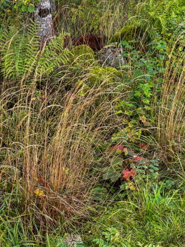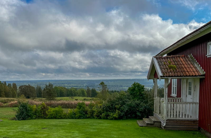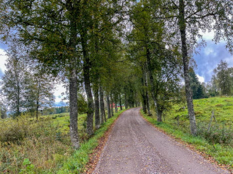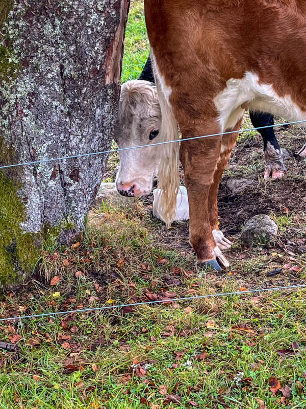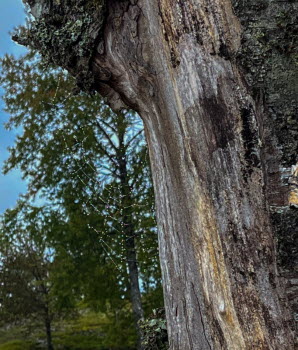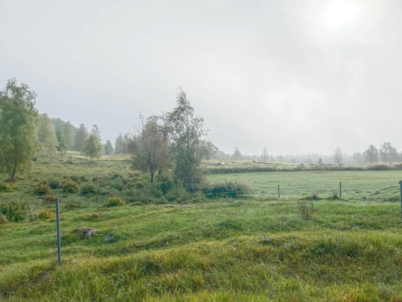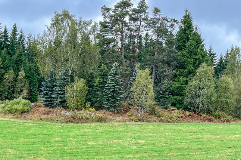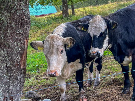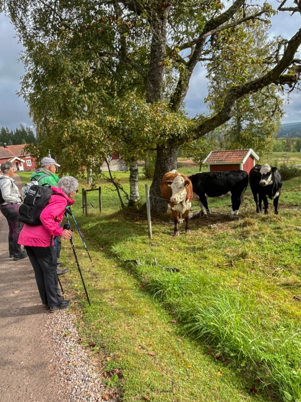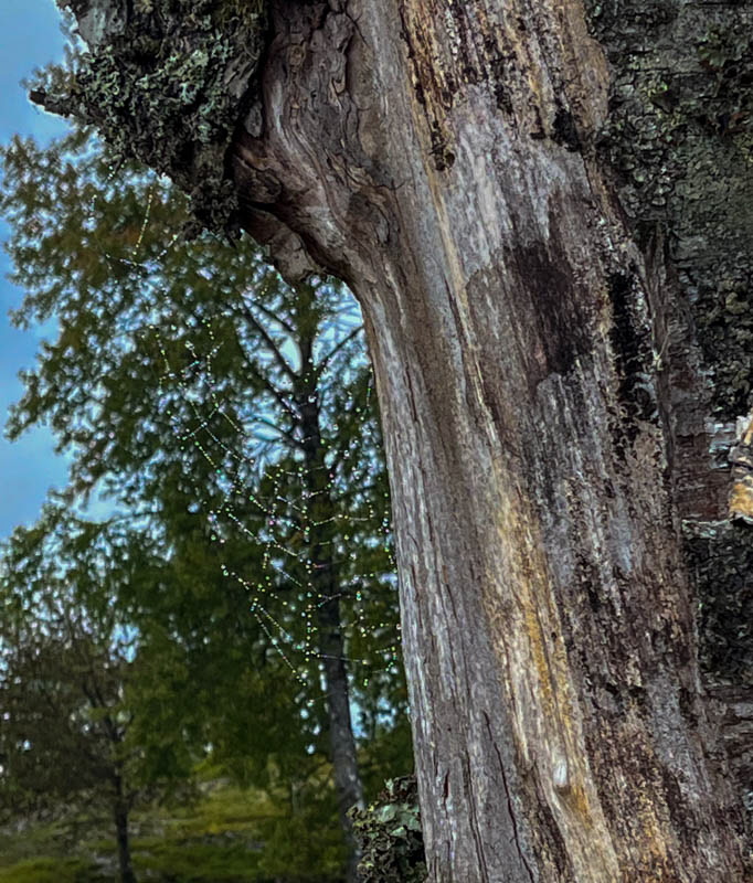 En fin åkerholme med ädelgranar. Korna var nyfiken på oss och alla ville vara med på bild. Vid Knaggebo gård är det en fin utsikt mot Bjurbäck. Efter gården är det en vacker björkallè. Där på en torr stam fanns ett spindelnät med daggdroppar.
