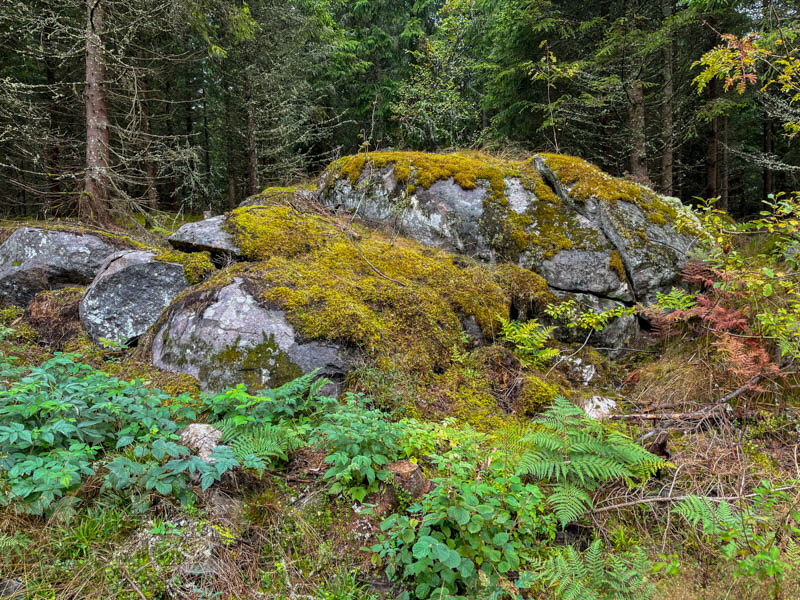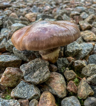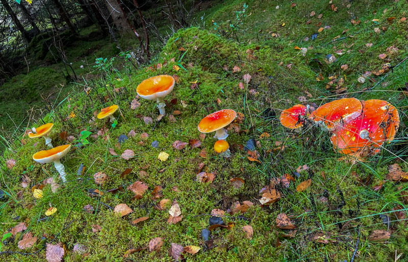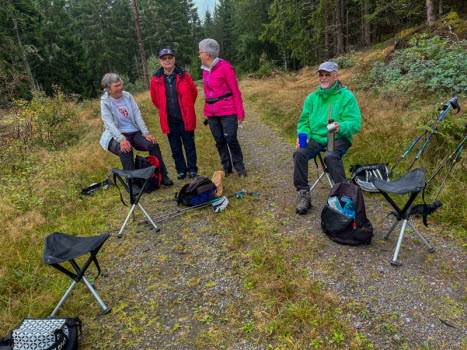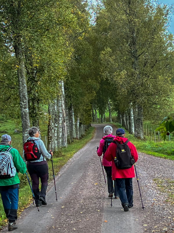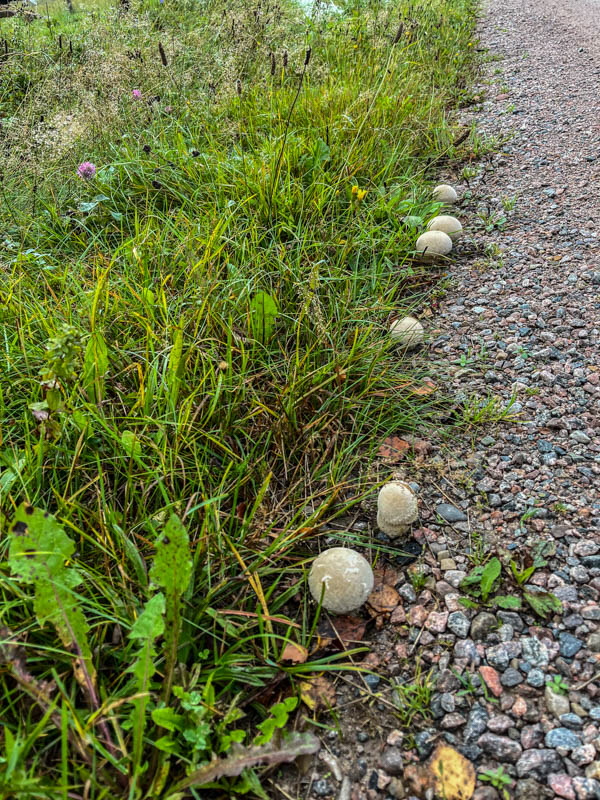 Vi åkte till Knaggebo och gick mot Torpet och skogsvägen tillbaka. Lite disigt i början, men diset tog solen hand om. Det var många olika svampar bl.a. skålröksvamp och citrongul slemskivling och många bruna och vita svampar.