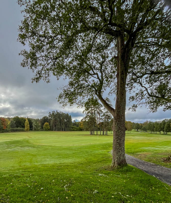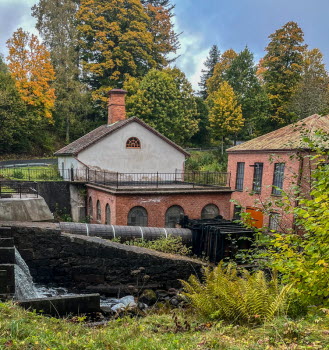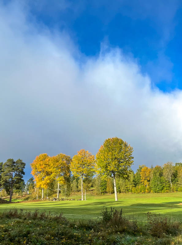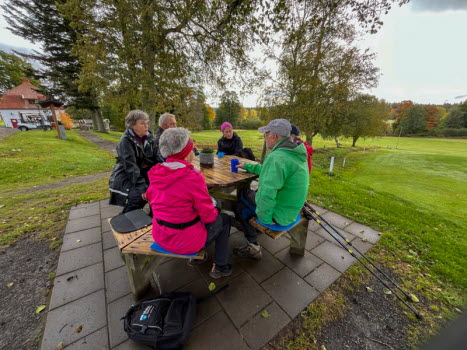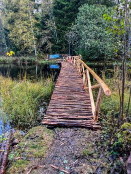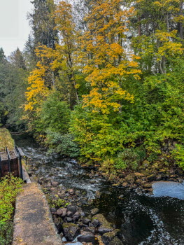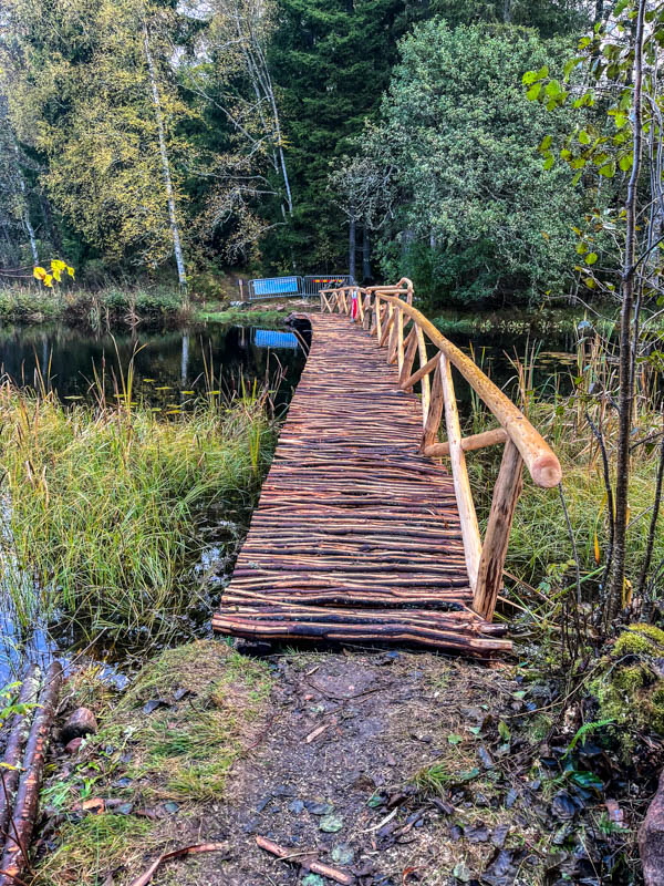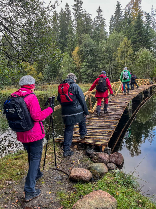 Vi premiärgick över bron och det är bara ryggstödet på soffan som inte är klart. Efter bron låg rester av den gamla bron. I en siktgata ser man bron. Vackert odonris och vackra höstgula aspar. Vi fikade vid klubbhuset och vid bron tittade vi på vattenflödet.