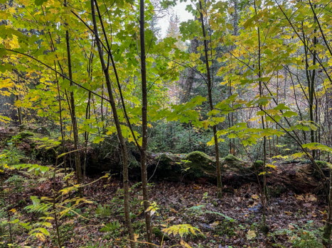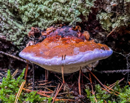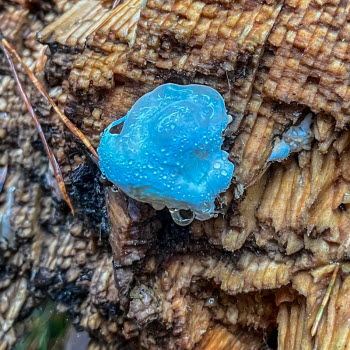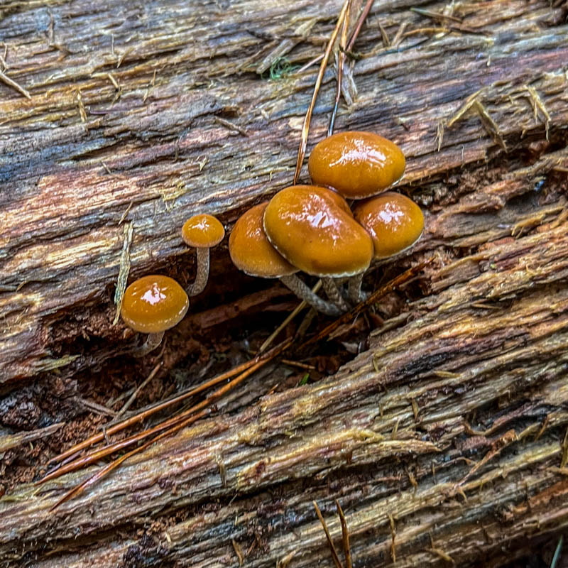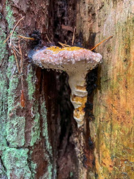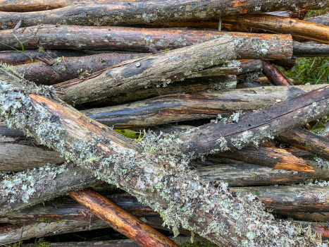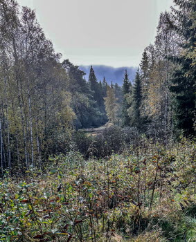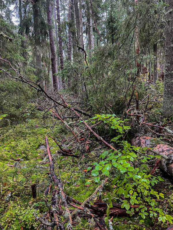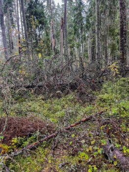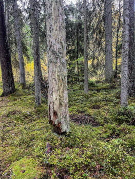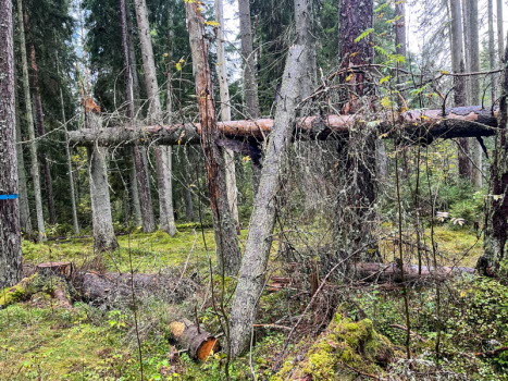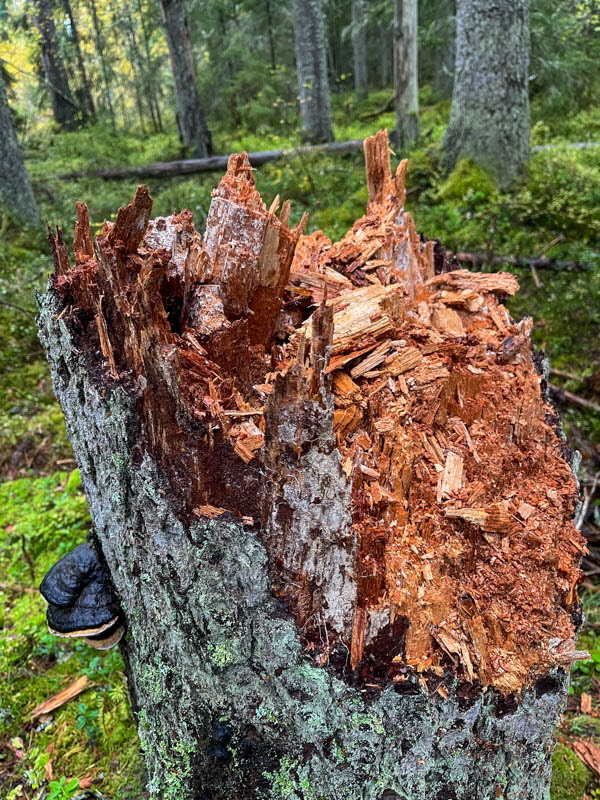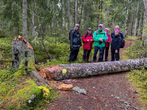 Vi kollade in resterna av "pudeln" och klibbtickornas utveckling. En murken granstam låg över stigen och en bit ifrån som väntar på att falla. Det är mycket nedfallet i skogen och en del föll nog i helgens kraftiga blåst.